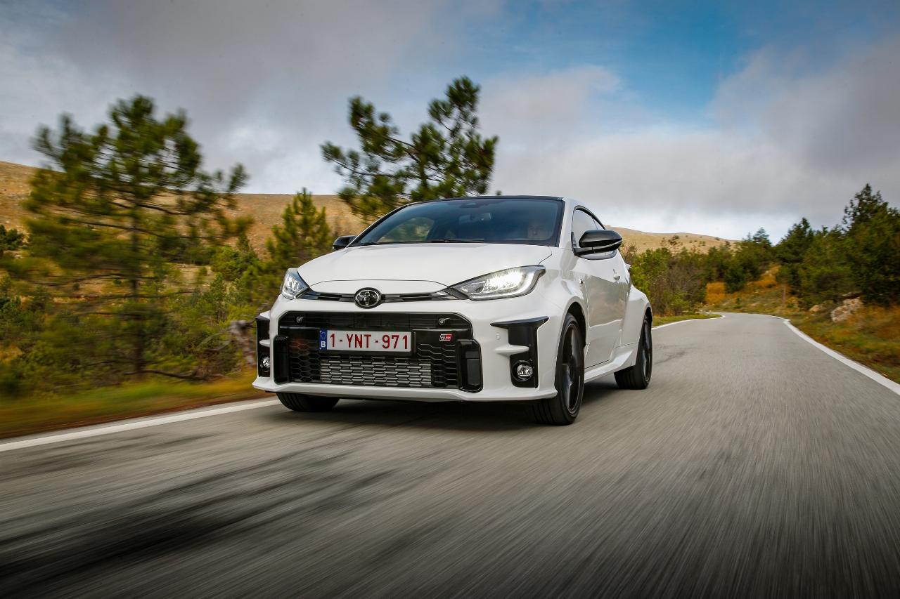 Das mit dem „High Performance“-Paket serienmäßige Torsen-Sperrdifferenzial verbessert die Traktion des kleinen Allradlers. Der Sprint auf 100 km/h gelingt so innerhalb von 5,5 Sekunden. Noch mehr Agilität und Fahrspaß garantiert eine individuelle Fahrzeugabstimmung, die die Expertise des Toyota Gazoo Racing World Rally Teams nutzt. Das wahlweise in Karminarot Metallic oder Platinumweiß Perleffekt lackierte Sondermodell fährt mit Vollausstattung und eigenständigen Designakzenten vor. Neben geschmiedeten 18-Zoll-Leichtmetallfelgen im Zehn-Speichen-Design verfügt der Dreitürer beispielsweise über rot lackierte Sportbremssättel auf den zweiteiligen, geschlitzten 356-Millimeter-Scheiben. Zusätzliche Lufteinlässe liefern ausreichend Kühlung für das Hochleistungsbremssystem.