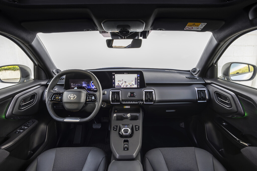 Der Urban Cruiser bietet mit 2,70 Metern einen 14 Zentimeter längeren Radstand als der Yaris Cross. Das niedrig angesetzte Armaturenbrett verstärkt das Raumgefühl. Zwei hochauflösende Displays – ein 10,25-Zoll-Kombiinstrument und ein 10,1 Zoll großer Multimedia-Touchscreen – sind optisch zu einer Display-Einheit verschmolzen und lassen sich individuell konfigurieren. Um die Sicht auf das digitale Kombiinstrument zu verbessern, ist das Lenkrad oben leicht abgeflacht. Durch ein vereinfachtes Design wurden einige Bedienelemente von physischen Schaltern auf die zentrale Multimedia-Touchscreen-Steuerung verlagert, darunter auch die Sitzheizung. Die Klimaanlage lässt sich entweder über Tasten oder über den Touchscreen bedienen. Über die „My Toyota“-App lassen sich Funktionen wie Batterieladung, Reichweitencheck, Vorklimatisierung und Türverriegelung bequem per Fernzugriff steuern.