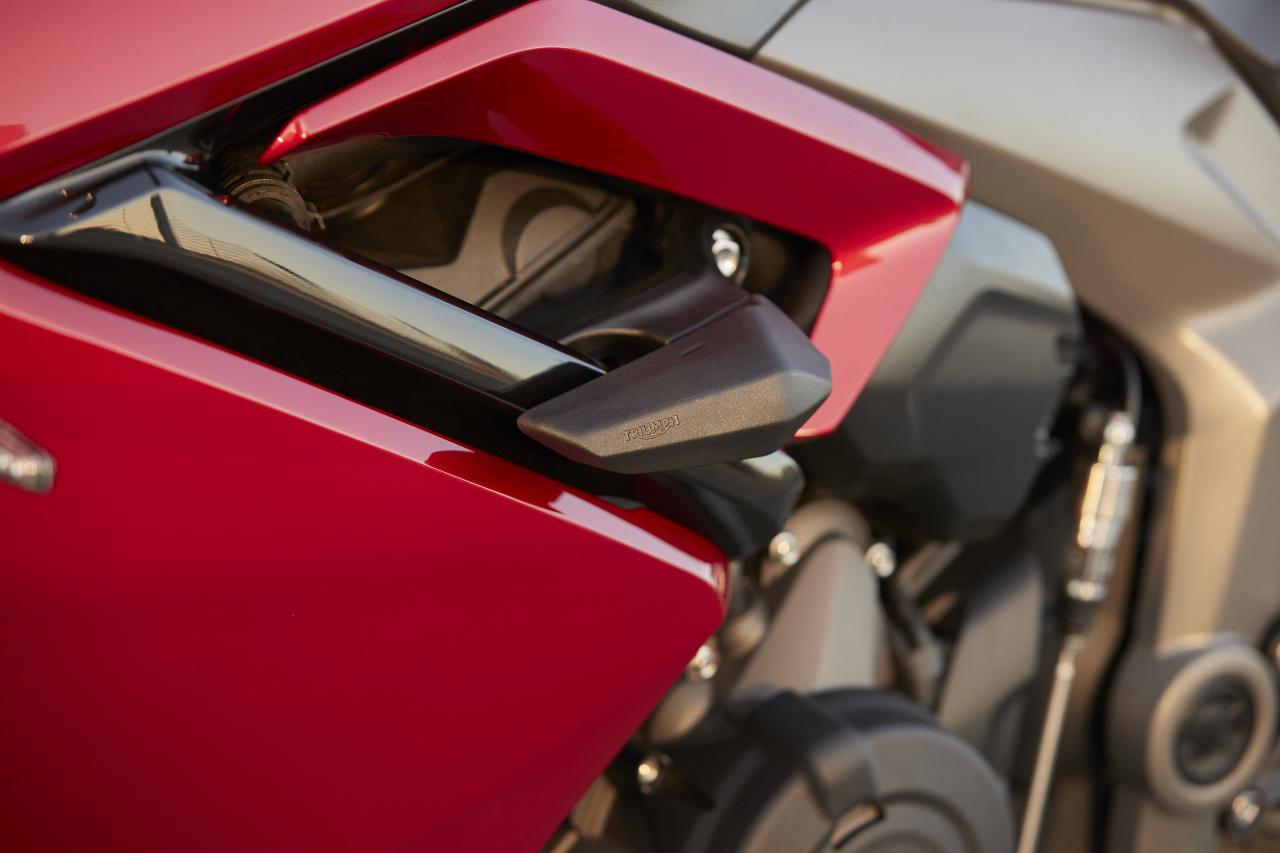 Der in vielen Bereichen umfangreich überarbeitete Dreizylinder mit neuer Auspuffanlage liefert 95 PS statt 80 PS und entwickelt mit 69 Newtonmetern neun Prozent mehr Drehmoment als Trident und Tiger Sport. Die Höchstleistung wird bei 11.250 Umdrehungen in der Minute erreicht, der rote Bereich beginnt bei 12.600 Touren. Bereits ab etwas über 3100 Umdrehungen liegen über 80 Prozent des maximalen Drehmoments an.
