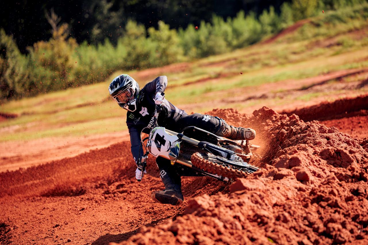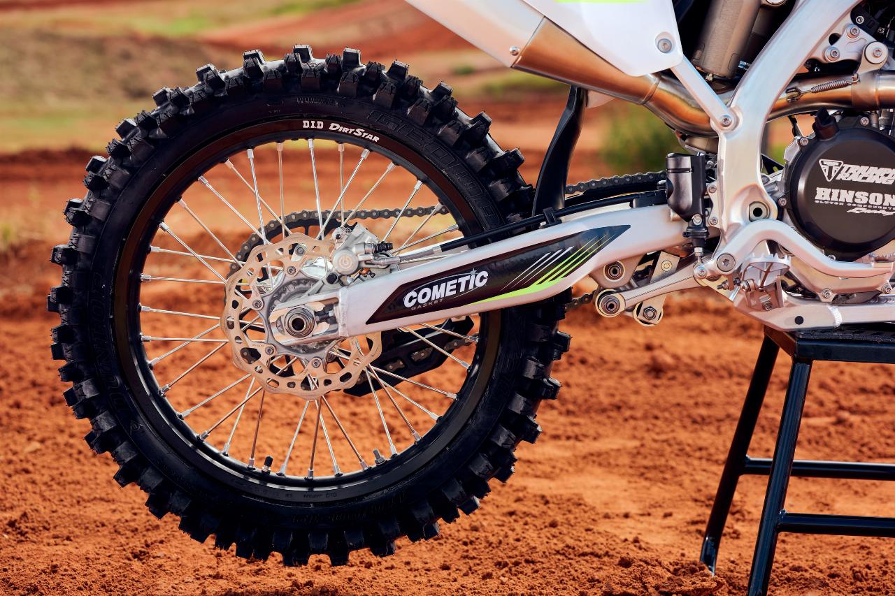 Das Fünf-Gang-Getriebe des 450-Kubik-Einzylinders besitzt serienmäßig einen Quickshifter für kupplungsloses Hochschalten vom zweiten in den letzten Gang. Es gibt eine Reihe von wählbaren Motorkennfeldern, von denen eines von Rick Carmichael selbst festgelegt wurde. Die Parameter für die Traktionskontrolle und die Launch Control können per App verändert werden.