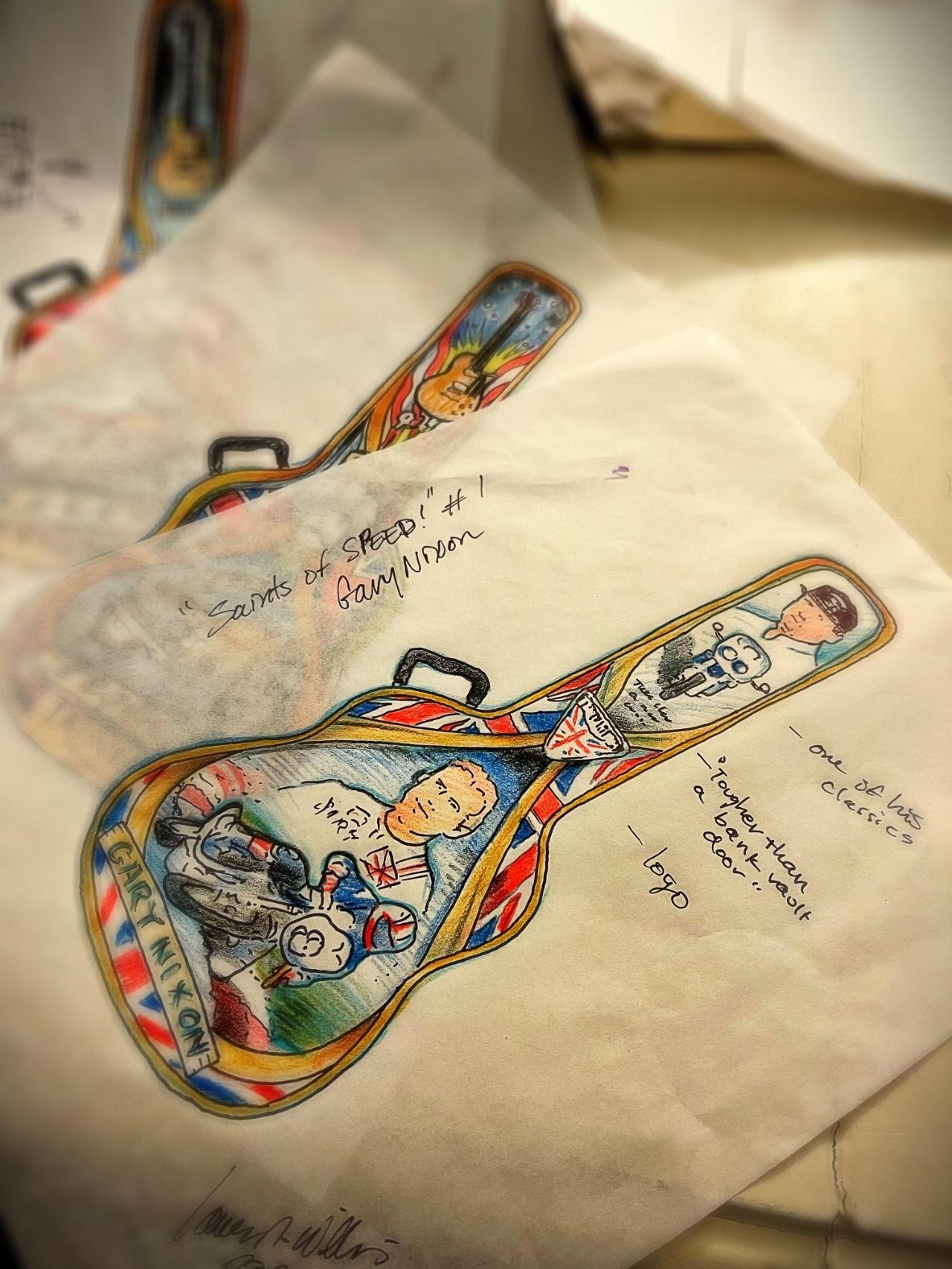 Bei den Gitarren handelt sich um eine Epiphone 1959 Les Paul Standard als detailgetreue Repikla. Sie trägt die Unterschrift von Billy Duffy, Mitglied der englischen Rockband „The Cult“. Die Epiphone J-200 ist eine Hommage an die Gibson SJ-200, zu der unter anderem Musiklegenden wie Emmylou Harris, Elvis, Jimmy Page, Bob Dylan, George Harrison und The Edge gegriffen haben. Signiert ist die Akustikgitarre vom amerikanischen Countrymusiker Big Kenny von „Big & Rich“. Die Epiphone SG Standard, die mit Bands wie „AC/DC“, „The Who“, „Cream“ und „Black Sabbbath“ verbunden ist, ist das dritte Stück. Unterschrieben ist die Gitarre vom kanadischen Singer-Songwriter Clayton Bellamy von „The Road Hammer“.