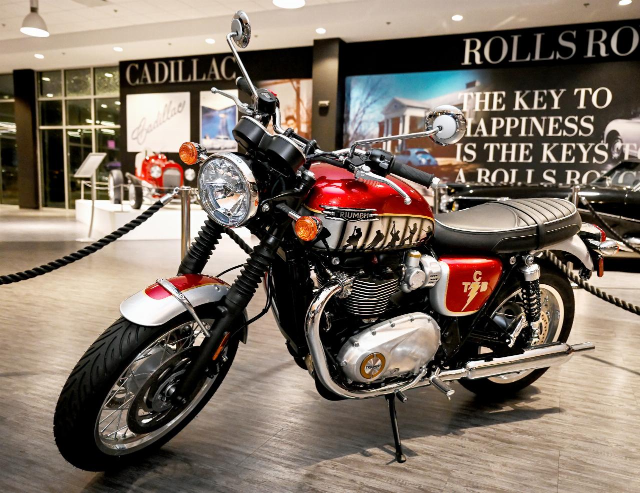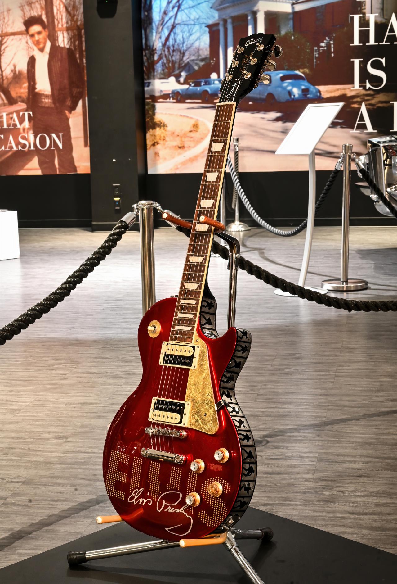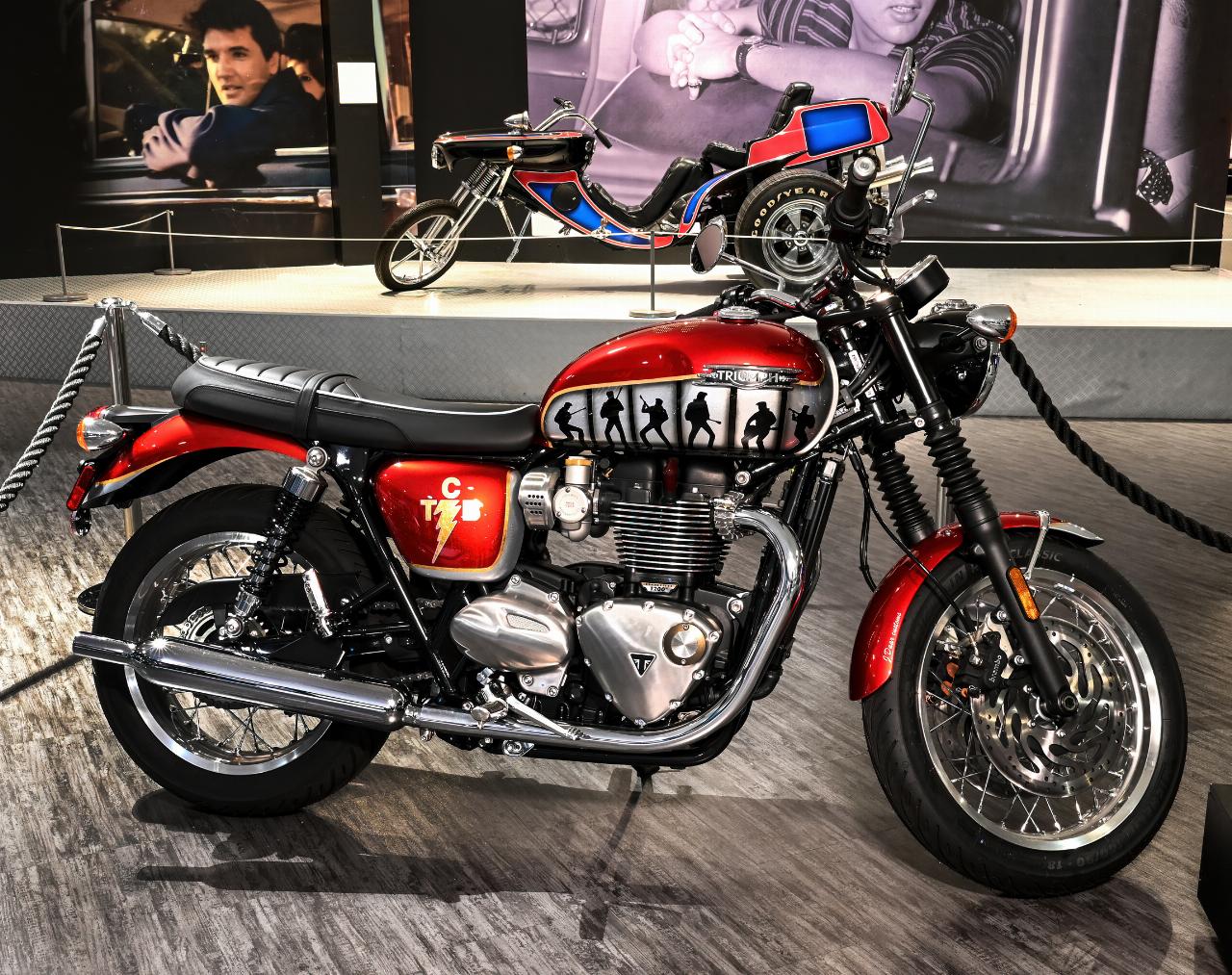 Das versteigerte Motorrad orientiert sich am Design der Originalmachinen, die Elvis Presley 1965 für sich und seine Freunde kaufte sowie an der Bonneville Desert Sled, die der „King“ im Film „Stay Away, Joe“ von 1968 fuhr. Bei der Farbauswahl in Rot, Silber und Gold ließ sich der Künstler vor allem vom Look der berühmten Comeback-Special-TV-Show des Künstlers im Dezember 1968 leiten. Für die Proben nutzte der Musiker damals eine Gibson Les Paul, die Presley anschließend seinem Koch schenkte. J Daar gestaltete für die Auktion ein entsprechendes Exemplar im Stil der Triumph. (aum)