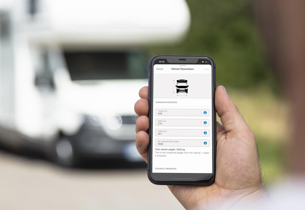 So werden beispielsweise Tunnel oder Brücken vermieden, die aufgrund von Beschränkungen der Durchfahrtshöhe, Kurvenradien oder Fahrbahnbreite nicht passiert werden können oder dürfen. Der Fahrer sendet die gewählte Route dann von der App an die MBUX-Navigation im Fahrzeug (Mercedes-Benz User Experience). Sollte ein Caravan gezogen werden, wird auch das beim Streckenvorschlag berücksichtigt.