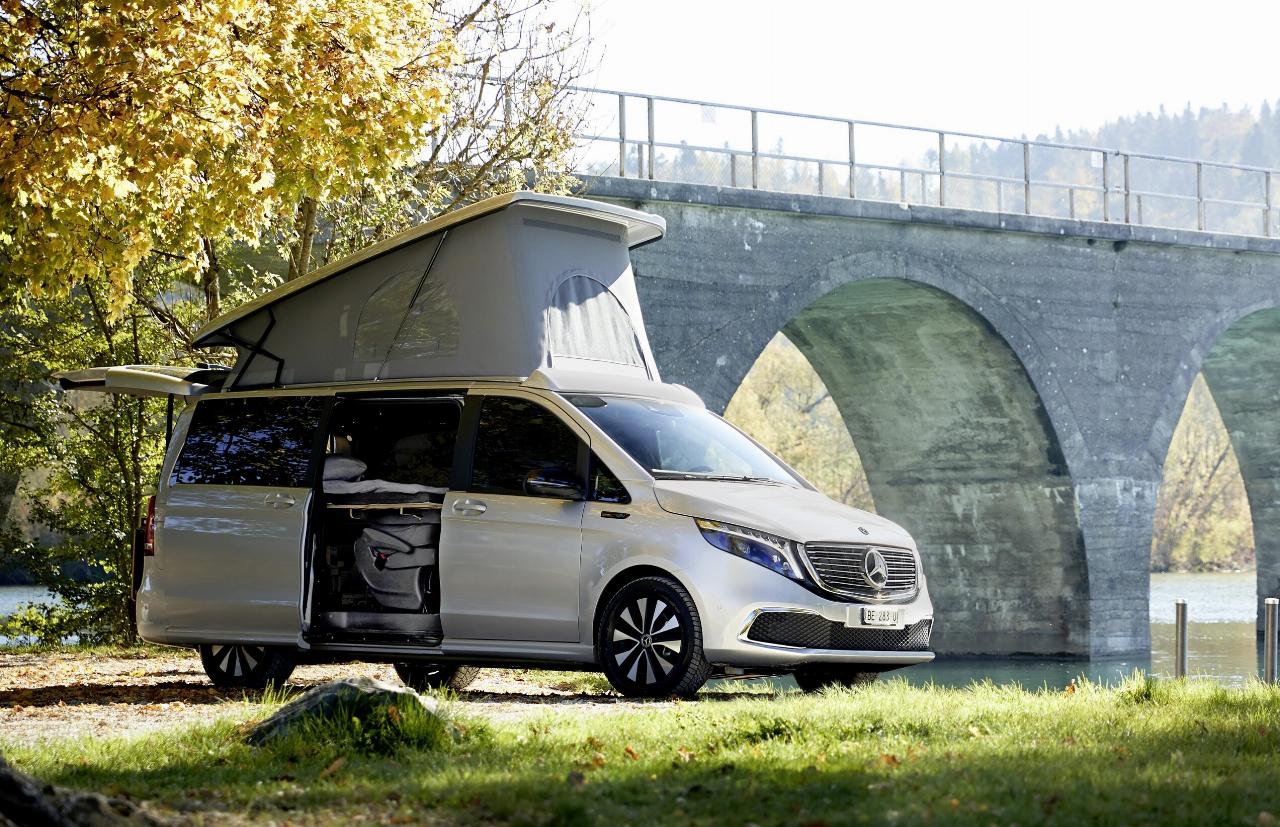 Der erste Mercedes-Camper mit rein elektrischem Antrieb basiert auf der EQV-Baureihe, die je nach Batterieausführung bis zum 363 Kilometer weit mit einer Ladung kommt. Der EQV 300 hat einen Akku mit 90 kWh Kapazität. Die Version EQY 250 mit der 60-kWh-Batterie schafft eine Reichweite von bis zu 236 Kilometer. Beide Modelle sind in den Längen 5,14 oder 5,37 Meter zu haben. An der Schnellladesäule lädt der EQV in 45 Minuten von zehn auf 80 Prozent. Der Camping-Stromer ist auf Wunsch mit einem intelligenten Navigationssystem und aktivem Reichweitenmanagement ausgestattet, das auf Dienste und Apps aus der Mercedes-Cloud zugreift.