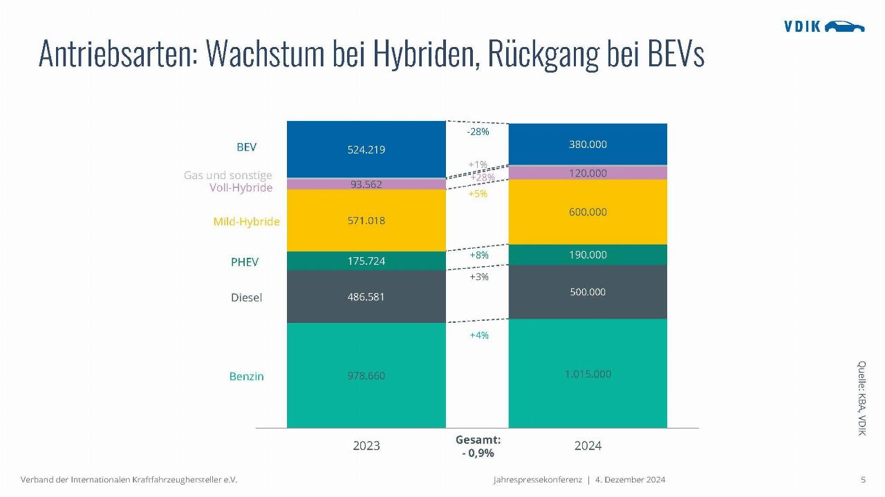 Nach aktuellem Stand geht der Verband bei den BEV für 2025 von 580.000 Einheiten aus. Das sind 200.000 Fahrzeuge mehr als dieses Jahr und damit auch etwas mehr als im Jahr 2023, dem letzten Jahr der Förderung. Damit hätten die BEV 2025 einen Anteil von 20 Prozent am Gesamtmarkt. Zum Vergleich: Dieser Anteil lag in 2024 bei 13,5 Prozent.