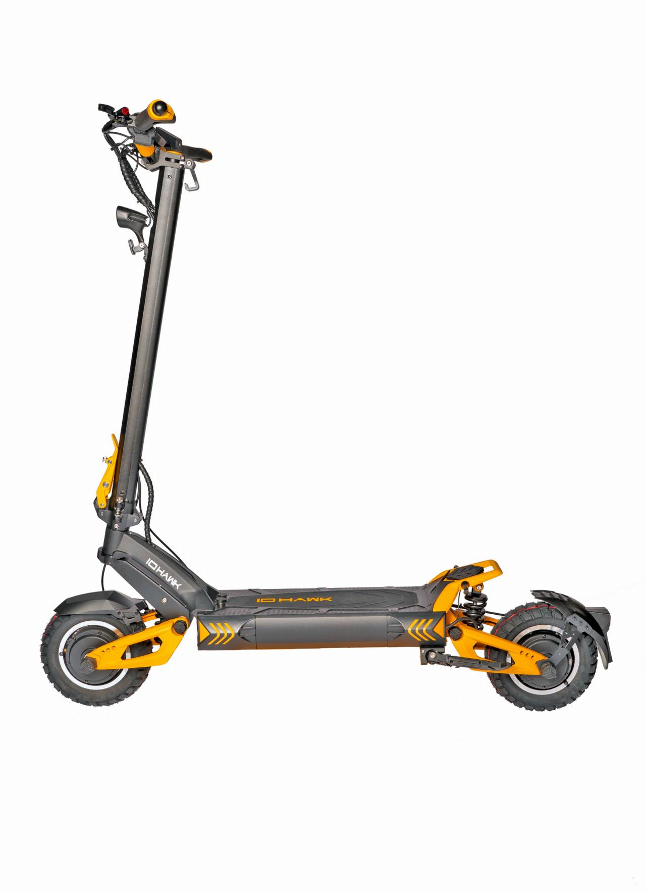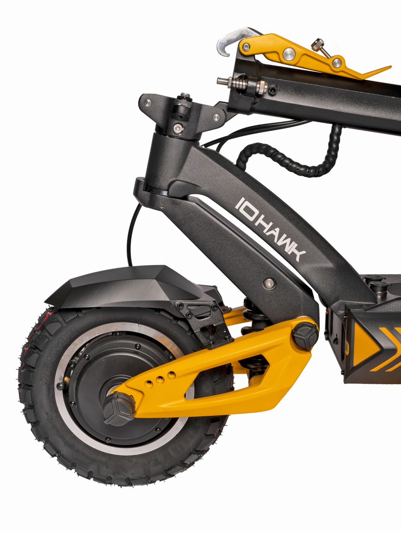 Das Krefelder Unternehmen IO Hawk bringt in Kürze mit dem Legacy einen neuen E-Kickscooter auf den Mark. Er soll über eine ungewöhnlich hohe Reichweite von 120 Kilometern verfügen. Wie schon das ausverkaufte Vorgängermodell Legend sticht auch der Legacy durch die grobstollige Luftbereifung und die gefederte Hinterachse hervor. Größte Besonderheit des Offroad-E-Scooters: Das 10-Zoll-Vorderrad wird ebenfalls in einer gefederten Schwinge geführt. Zudem verfügt der IO Hawk Legacy über ein System, dass das Blockieren der Räder beim Bremsen verhindern soll. Eine Scheibenbremse auch hinten, Blinker, Hupe und Bremslicht sorgen ebenfalls für größtmögliche Sicherheit im Straßenverkehr.