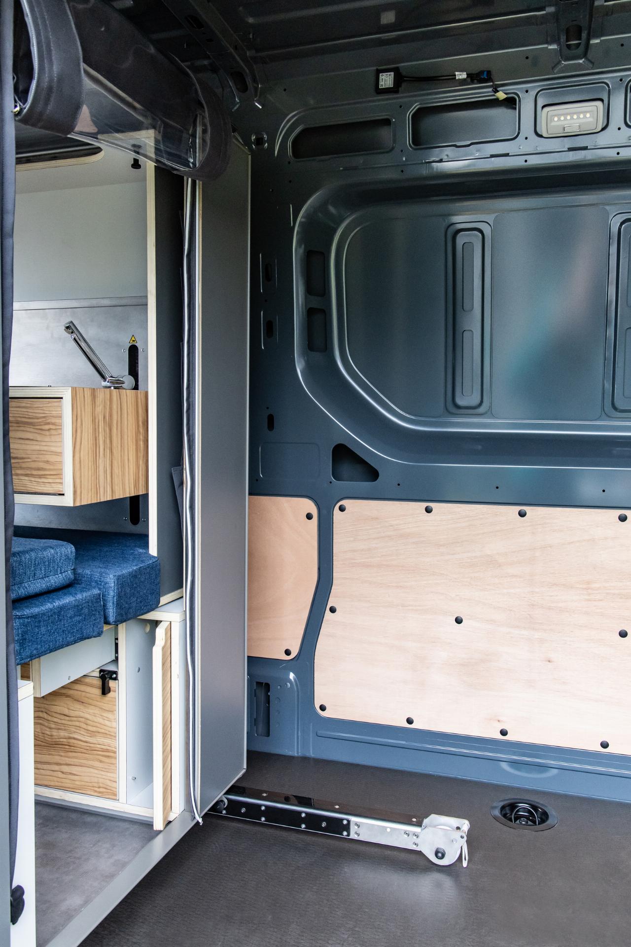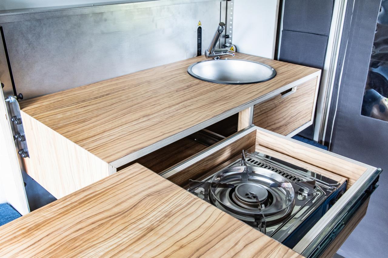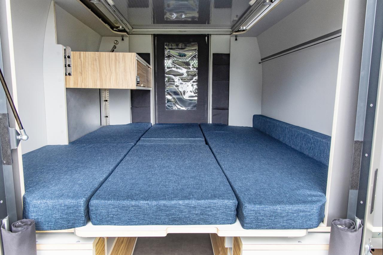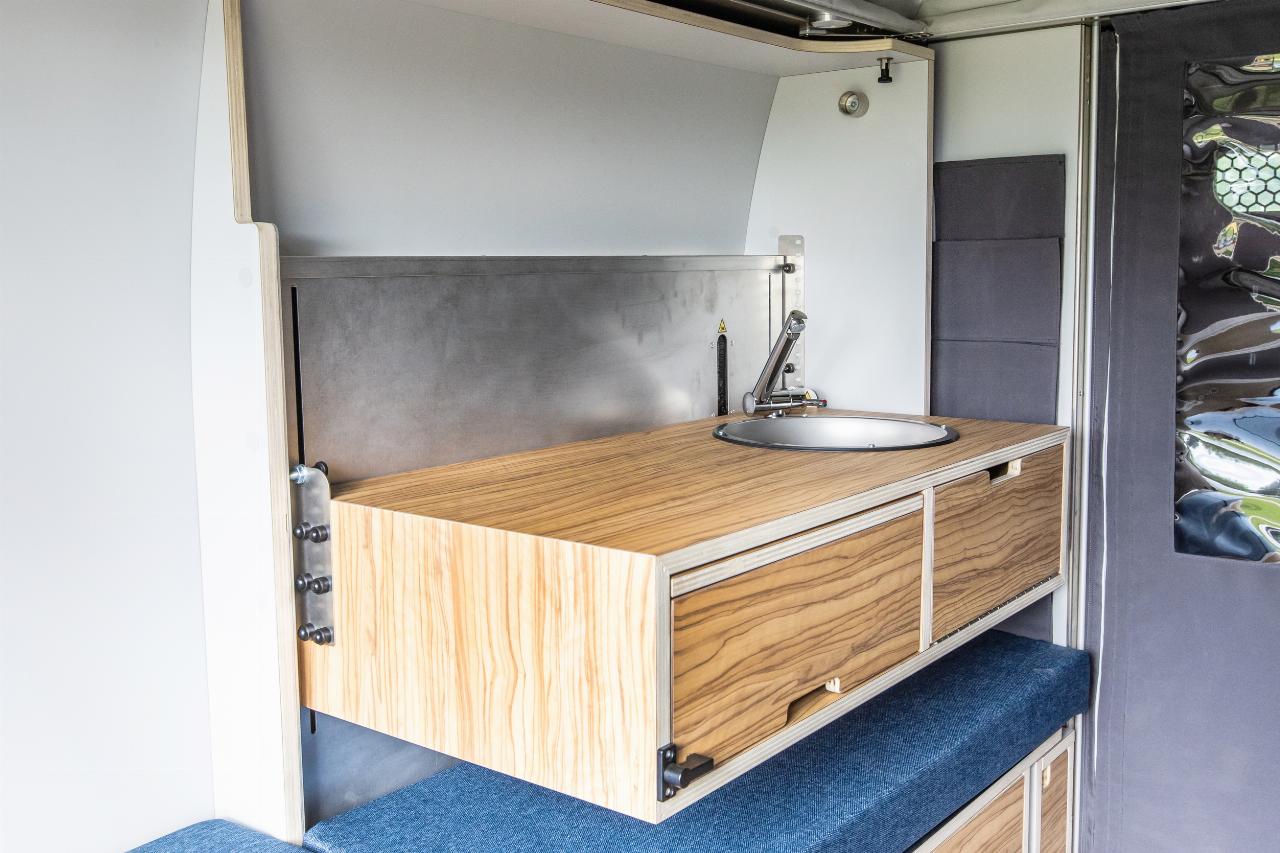 Das Wohnmodul von Plug Van bietet ein Bett für zwei Personen sowie zahlreiche Fächer und Stofftaschen, um Töpfe, Geschirr und Kleidung unterzubringen. Der Küchenblock ist höhenverstellbar und hat eine integrierte Spüle. Im Modul sind mehrere Wasseranschlüsse installiert, die sich beispielsweise dafür eignen, Geschirr zu spülen oder draußen am Heck schmutzige Schuhe abzuwaschen. Die Tanks für Frisch- und Abwasser fassen jeweils 43 Liter. Darüber hinaus gibt es zahlreiche, individuell konfigurierbare Ausstattungsmerkmale, darunter ein separates Bad-Modul, eine Kühlbox, eine größere Zusatzbatterie, ein SolarmModul. Die Farbe des Sitzpolsters sowie des Holzdekors lässt sich auswählen. Die Innenraumbeluchtung besteht aus LEDs. (aum)