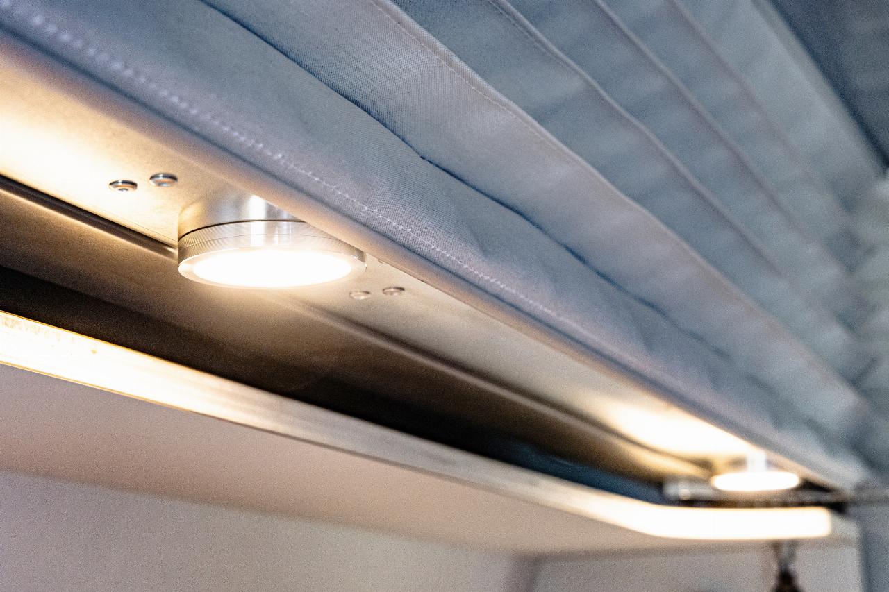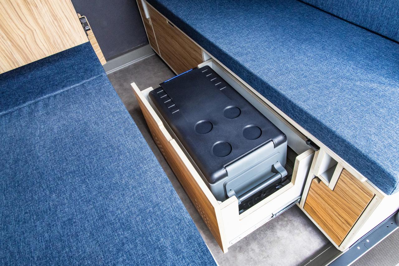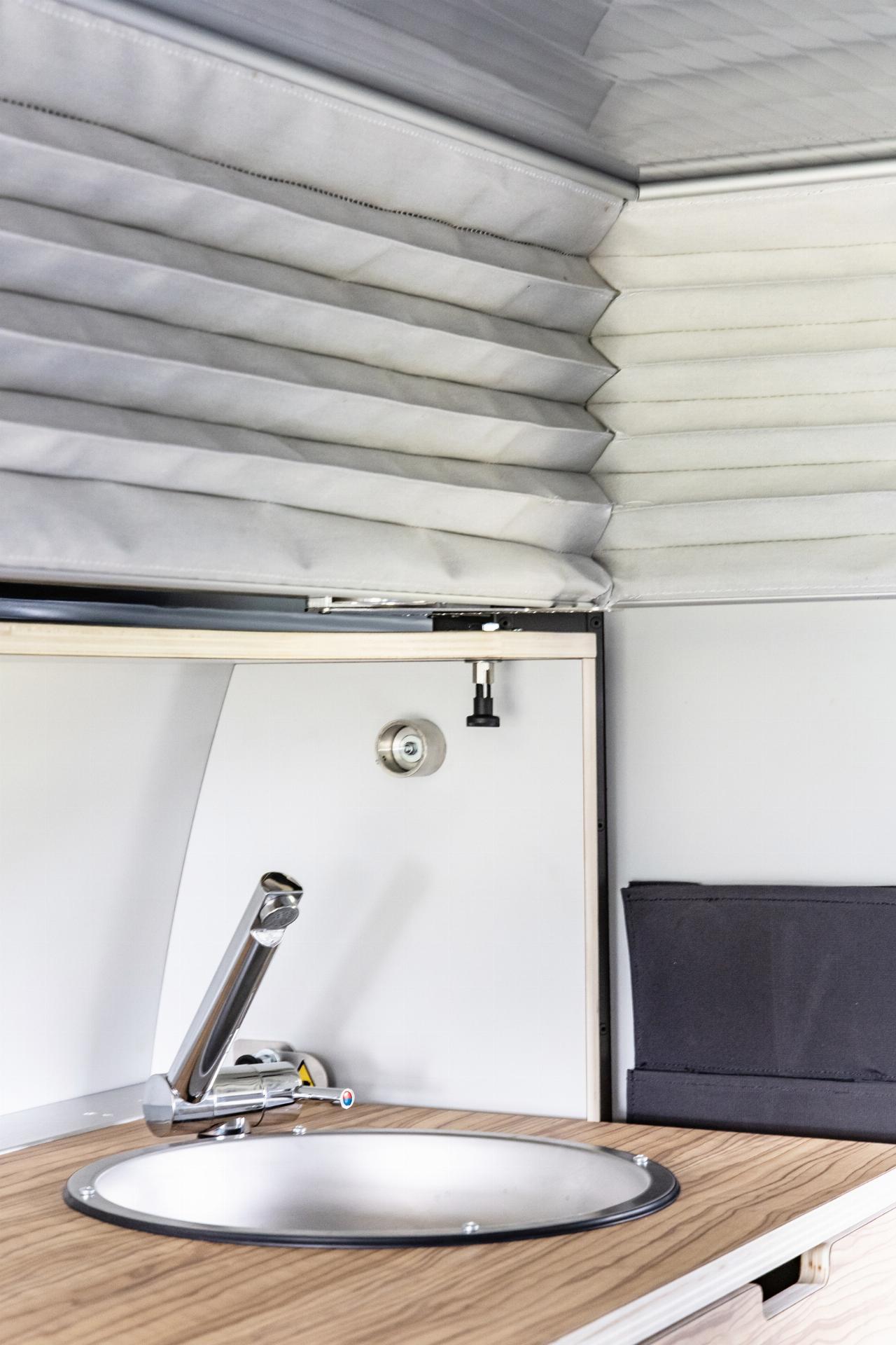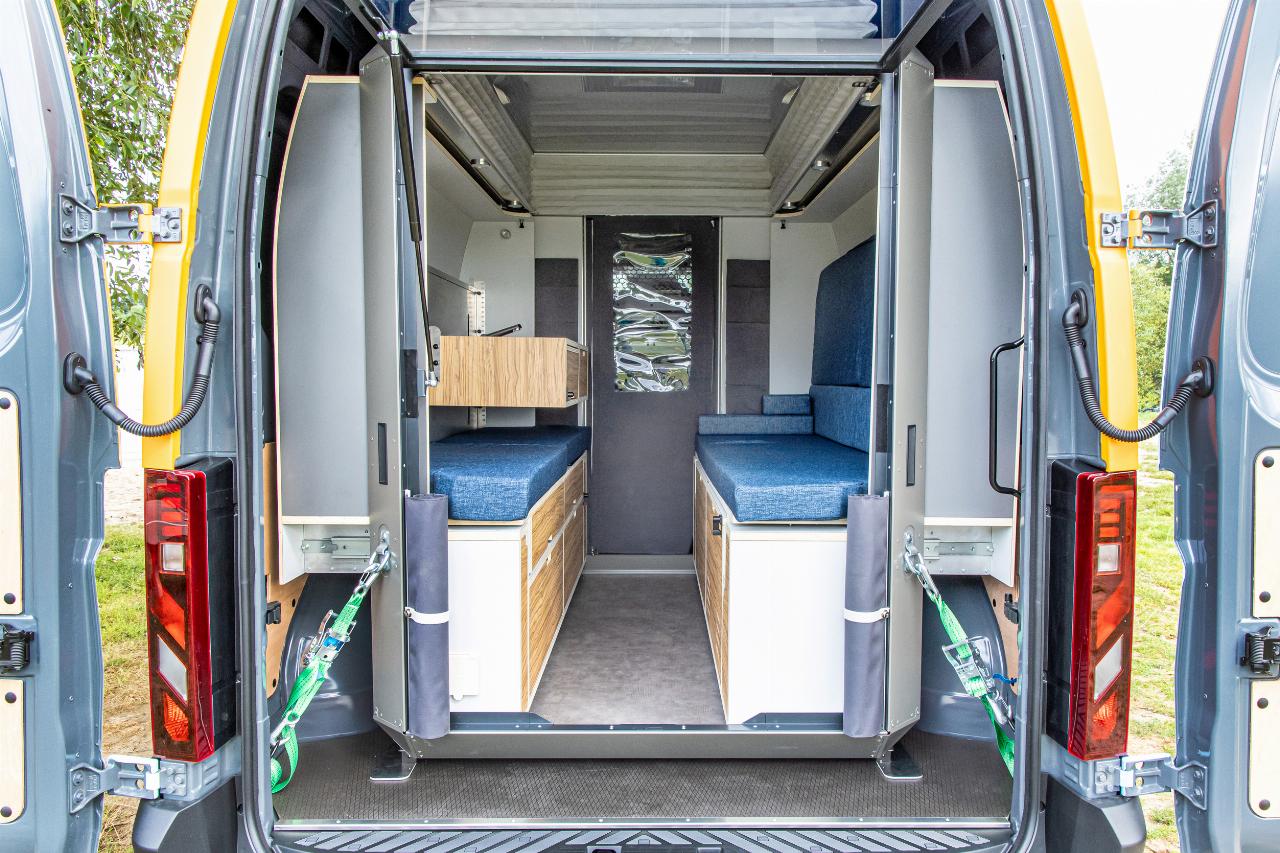 Das Wohnmodul von Plug Van bietet ein Bett für zwei Personen sowie zahlreiche Fächer und Stofftaschen, um Töpfe, Geschirr und Kleidung unterzubringen. Der Küchenblock ist höhenverstellbar und hat eine integrierte Spüle. Im Modul sind mehrere Wasseranschlüsse installiert, die sich beispielsweise dafür eignen, Geschirr zu spülen oder draußen am Heck schmutzige Schuhe abzuwaschen. Die Tanks für Frisch- und Abwasser fassen jeweils 43 Liter. Darüber hinaus gibt es zahlreiche, individuell konfigurierbare Ausstattungsmerkmale, darunter ein separates Bad-Modul, eine Kühlbox, eine größere Zusatzbatterie, ein SolarmModul. Die Farbe des Sitzpolsters sowie des Holzdekors lässt sich auswählen. Die Innenraumbeluchtung besteht aus LEDs. (aum)