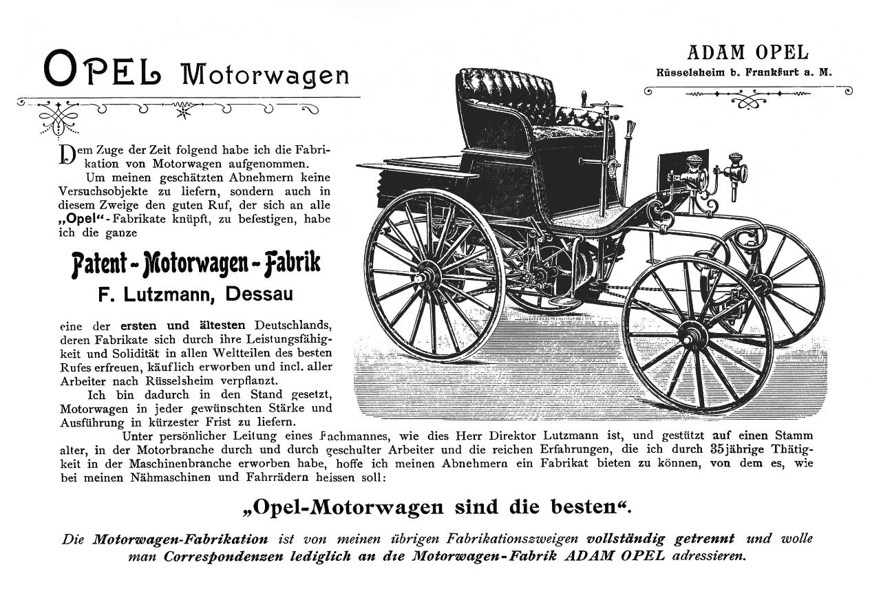 Fritz und Wilhelm Opel hatten im September 1897 die erste deutsche Automobilausstellung in Berlin besucht und waren dort auf der Suche nach einem weiteren Standbein für die Firma auf Friedrich Lutzmann getroffen. Der Hofschlossermeister und „Großherzoglich Anhaltische Hofwagenbauer“ fertigte seit 1894 Motorwagen. Er lud die beiden Brüder in seine Fabrik nach Dessau ein. Stand zunächst eine Kooperation zur Debatte, unterbreiteten die Besucher aus Rüsselsheim dem Dessauer schließlich ein gut dotiertes Kaufangebot für Grundstück, Gebäude und Werkstatteinrichtung – also die komplette Fabrikation. Am 21. Januar 1899 unterzeichneten Wilhelm Opel und Friedrich Lutzmann schließlich den Vertrag über einen Kaufpreis von 116.887 Mark – und die Anhaltische Motorenwagenfabrik ging an Opel über. Der gesamte Betrieb wurde samt Mitarbeitern und Maschinen von Dessau an nach Rüsselsheim verlegt. Friedrich Lutzmann selbst erhält zudem einen auf zwei Jahre befristeten Vertrag als „Betriebsleiter der Adam Opel Motorfahrzeug-Fabrik“.