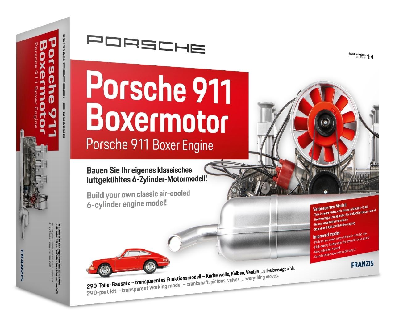 Dieser Miniaturbausatz des legendären Porsche Sechszylinder-Boxermotors dürfte nicht nur Fans der Stuttgarter-Sportwagenschmiede begeistern. Dabei ist die Montage des detailgetreuen Zweiliter-Motors aus dem Porsche 911 von 1966 überhaupt nicht schwierig. Der aus über 290 Teilen bestehende Bausatz wird ohne den Einsatz von Klebstoff einfach zusammengesteckt und verschraubt. Nach gut drei Stunden erhält man ein transparentes Motorenmodell im Maßstab 1:4, bei dem sich alle Teile wie beim großen Vorbild bewegen. So öffnen und schließen sich die Ventile, während die Kolben auf- und abwandern und die Kurbelwelle rotiert. Die Zündfunken in den Zylindern werden mit LEDs simuliert und für den originalgetreuen Motorsound sorgt ein kleiner Lautsprecher. Erhältlich ist der detailgetreue Funktionsmotor bei www.franzis.de für 199 Euro. (gb)