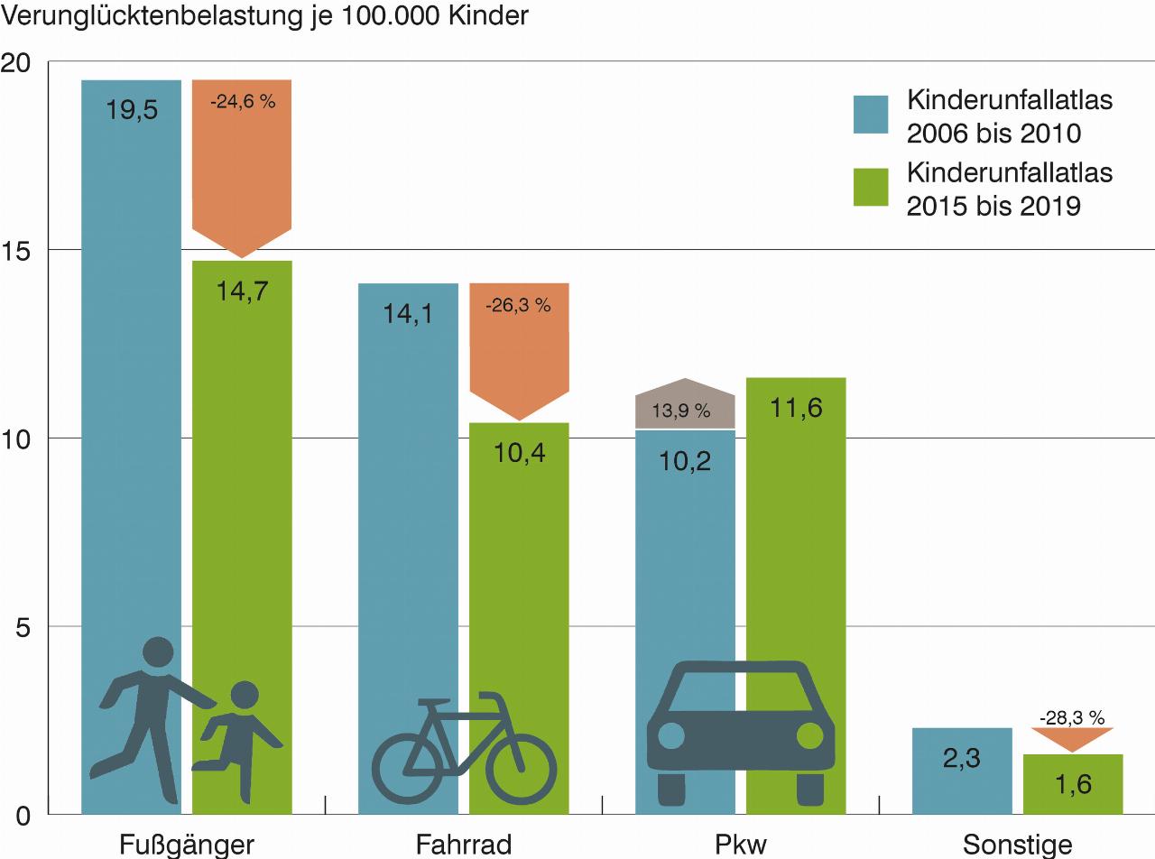 Immer weniger Kinder kommen bei schweren Verkehrsunfällen als Fußgänger oder Radfahrer zu Schaden. Das geht aus dem neuen Kinderunfallatlas der Bundesanstalt für Straßenwesen (BASt) hervor, der auf Unfallzahlen von bis zu 14-jährigen Kindern der Jahre 2015 bis 2019 basiert. So zeigen die Analysen über den 5-Jahreszeitraum dass pro Jahr rund 15 Kinder als Fußgänger und 10 als Radfahrer je 100.000 altersgleiche Einwohner schwer verunglückt sind. Gegenüber dem Vergleichszeitraum 2006 bis 2010 entspricht dies einem Rückgang von circa 25 beziehungsweise 26 Prozent.