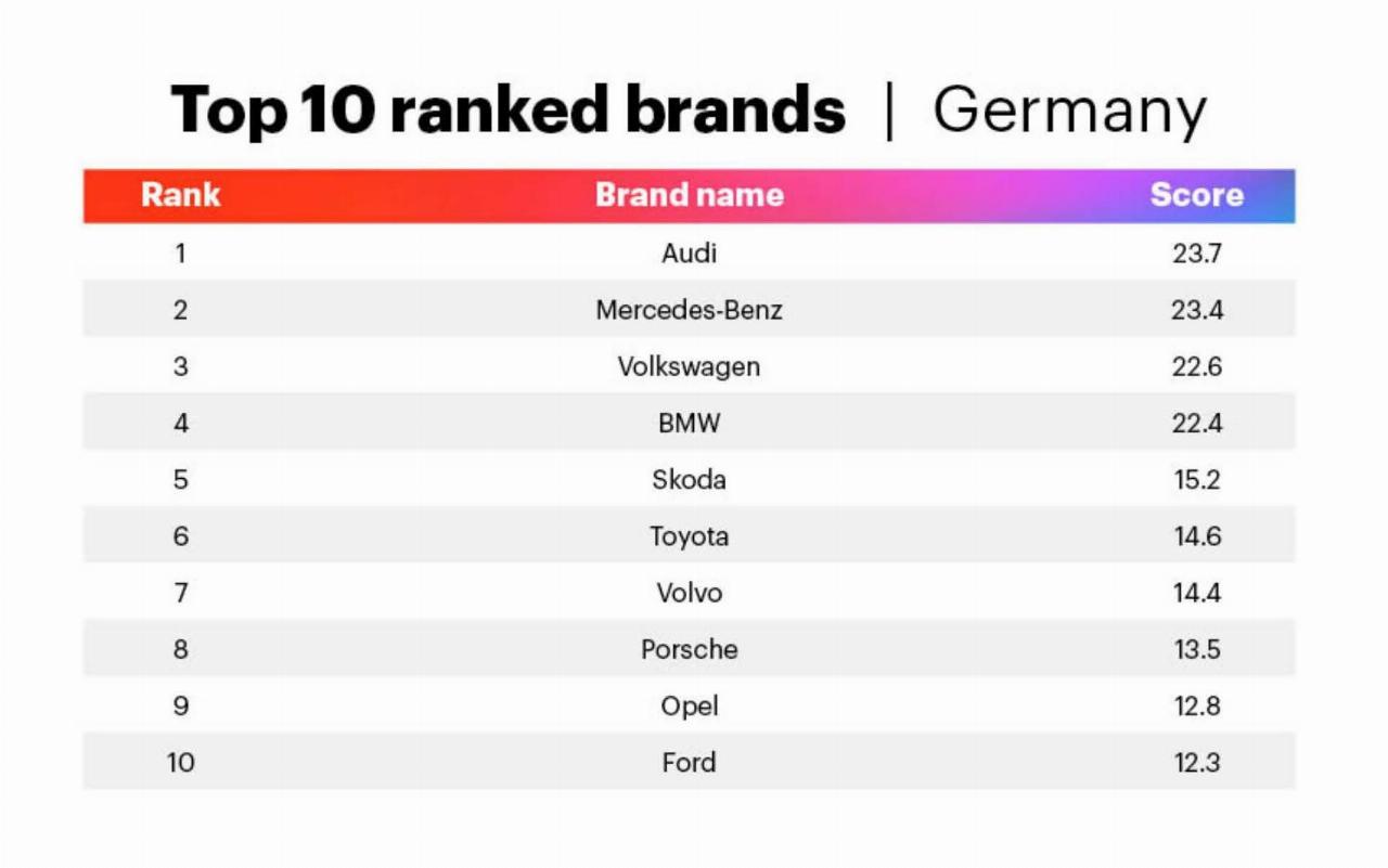 2023 überholt Audi die Stuttgarter Autoschmiede mit insgesamt 23,5 Scorepunkten. Mercedes-Benz ist mit 23,4 Punkten dicht auf und belegt Rang 2. Volkswagen erreicht in diesem Jahr Rang 3. Die Wolfsburger konnten sich damit im Vergleich zu den beiden Vorjahren um einen Rang verbessern. BMW rutscht auf Rang 4 (22,4 Scorepunkte). Skoda platziert sich auf Rang 5 (15,2 Punkte), unverändert zu den Jahren 2021 und 2022. Toyota erreicht Rang 6 (14,6 Punkte). Es folgen Volvo auf Rang 7 (14,4 Punkte), Porsche auf Rang 8 (13,5 Punkte), Opel auf Rang 9 (12,8 Punkte) und schließlich Ford auf Rang 10 (12,3 Scorepunkte).