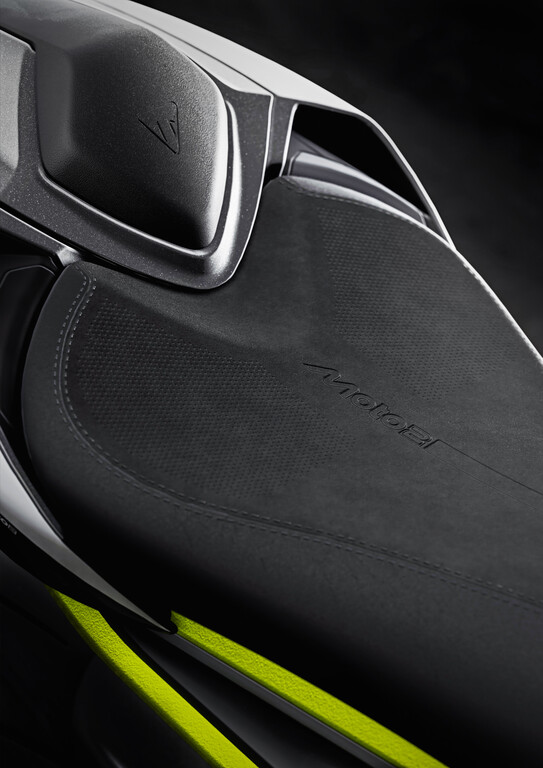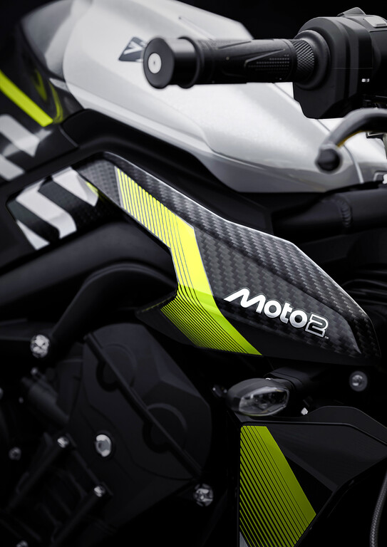 Bei der Moto 2 widerum sind die Seiten, der vordere Kotflügel, die Bugverkleidung und die Endkappe des Schalldämpfers aus gewichtssparendem Karbon gefertigt. Der Sitz des Editionsmodells hat eine „Moto 2“-Prägung und einem extra-griffigen Bezug. Weitere Merkmale sind ein neues, klares Rücklicht sowie ein lasergraviertes „Moto 2“-Logo auf dem Auspuffendrohr. Die auffällige Farbgebung in Mineral Grey und Crystal White wird durch einen Heckrahmen und Akzente in leuchtendem Gelb und einen passenden Streifen auf dem Hinterrad ergänzt. Die individuelle Fertigungsnummer findet sich auf der gefrästen oberen Gabelbrücke, die ebenfalls das Moto-2-Logo trägt, das auch auf dem Startbildschirm des TFT-Displays auftaucht.