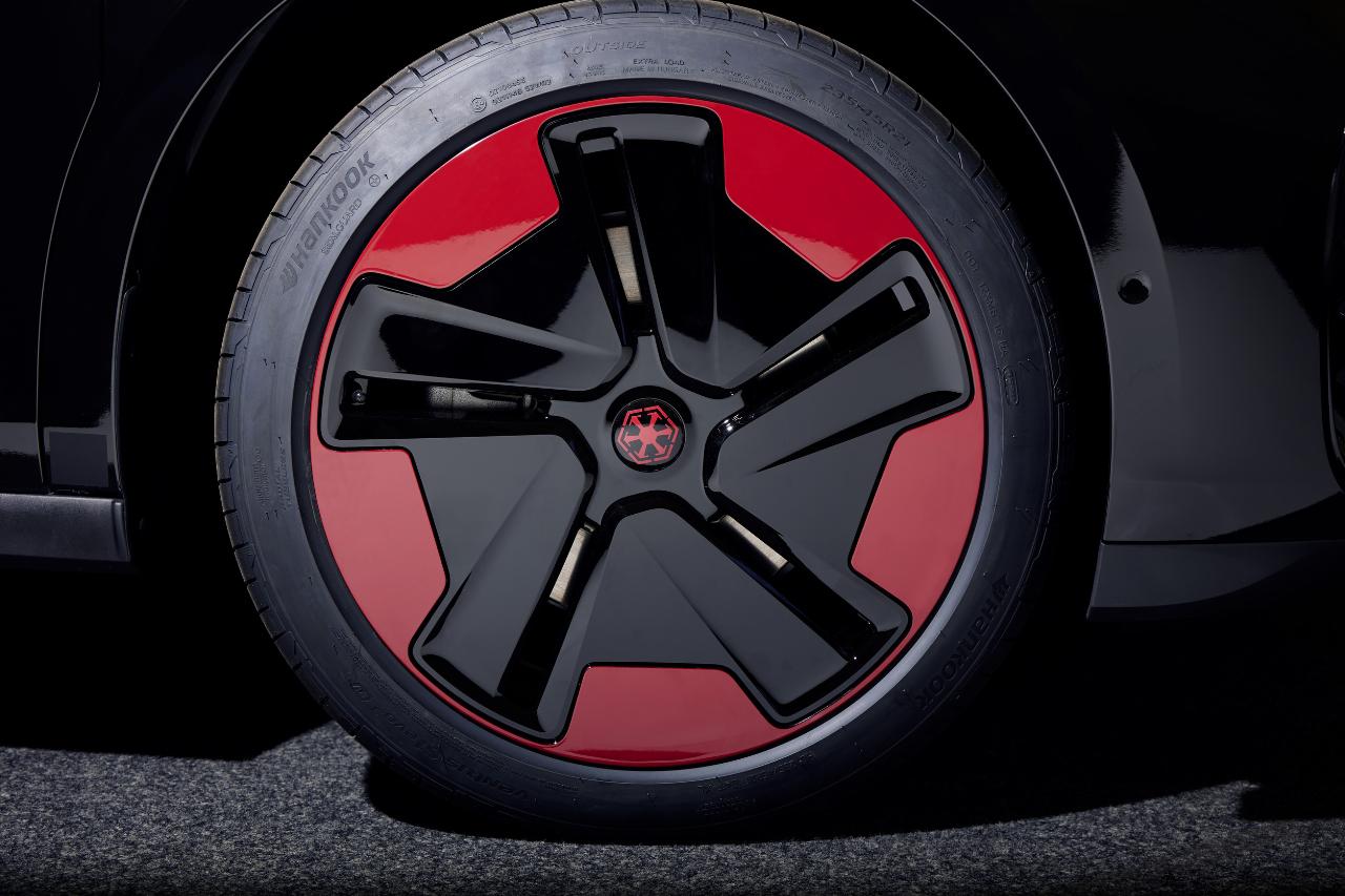 Basis der „Dark Side Edition” ist der ID Buzz Cargo. Düstere Schwarz- und Rottöne verkörpern die dunkle Seite der Macht. Die Folie ist im unteren Bereich des Fahrzeugs Schwarz glänzend, während der obere Teil des Fahrzeugs in mattem Schwarz gestaltet wurde ist. Seitenlinien, Scheinwerfer, Lichtleisten und Fensterflächen sind in einem kräftigen Rot gehalten, inspiriert von Darth Vaders Lichtschwert. Dazu kommt eine rote Unterbodenbeleuchtung. Die Nabendeckel der ebenfalls eigenständig gestalteten 21-Zoll-Felgen und die Karosserie tragen das Logo des Imperiums.