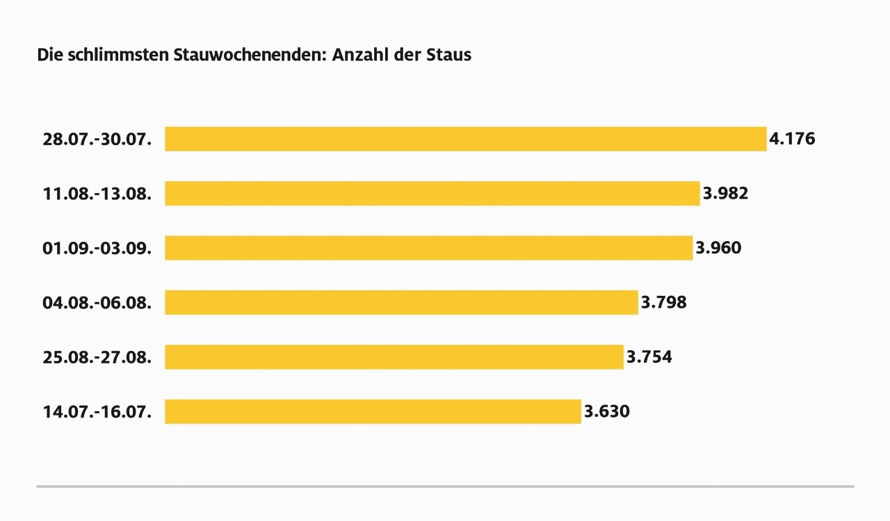Da nach wie vor ein Großteil des Reise- und Freizeitverkehrs an den Wochenenden stattfindet, hat der Automobilclub diese gesondert ausgewertet. Das staureichste Wochenende war vom Freitag, 28. Juli, bis Sonntag, 30. Juli, als ausnahmslos alle Bundesländer in den Sommerferien waren. Der ADAC registrierte insgesamt 4176 Staus mit einer Gesamtlänge von fast 9000 Kilometern und einer Gesamtdauer von etwa einem halben Jahr. Der staureichste Tag über die ganze Ferienzeit war, wie schon in den Jahren zuvor, der Freitag mit etwa doppelt so vielen Staus wie am Samstag und Sonntag. Die Liste der schlimmsten Stauautobahnen führt – bezogen auf Streckenabschnitte von 100 Kilometern Länge – wie im Vorjahr die A 99, der Autobahnring München, an. Auf den Plätzen zwei und drei folgen die A 8 und die A 3.
