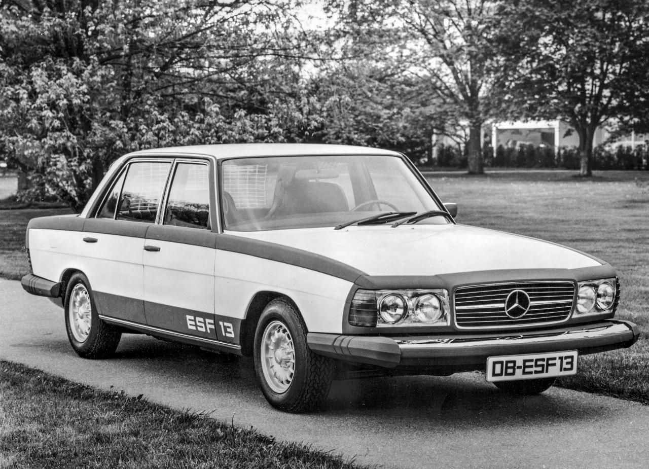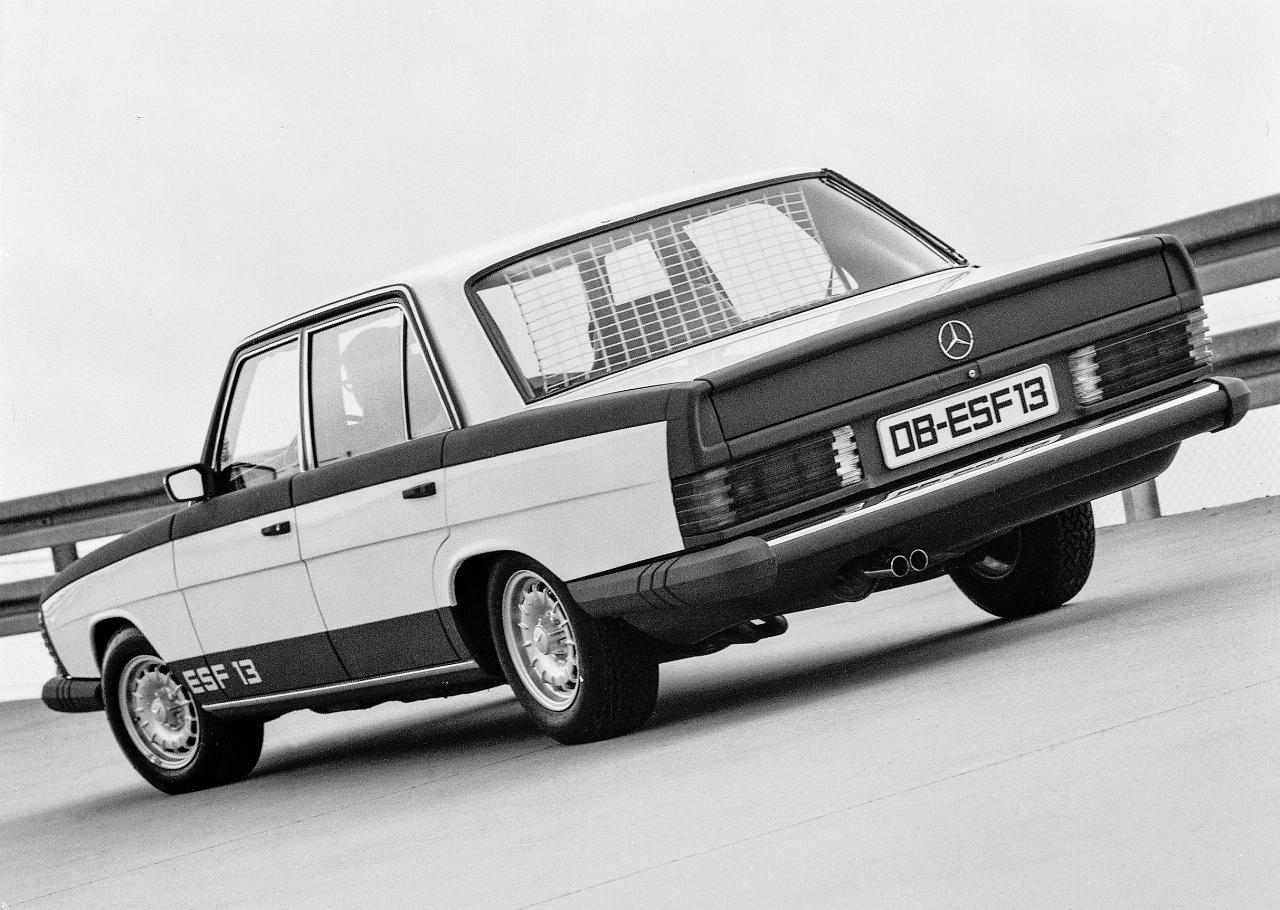 Mercedes-Benz stellte den ESF 13 am 31. Mai 1972 auf der Fachmesse „Transpo 72“ in Washington, D.C. vor. Wie sehr es seiner Zeit voraus war, durften damals auch die Designer mit großen schwarzen Partien auf der weißen Karosse zeigen, überall dort, wo Nachgiebigkeit gefragt war. Aber unter dem Schwarz und dem Weiß des auf der Basis einer S-Klasse aufgebauten ESF steckte Technologien, die mindestens ebenso wesentlich für die Sicherheit der Insassen waren wie die gut sichtbaren Knautschelement vorn und hinten.