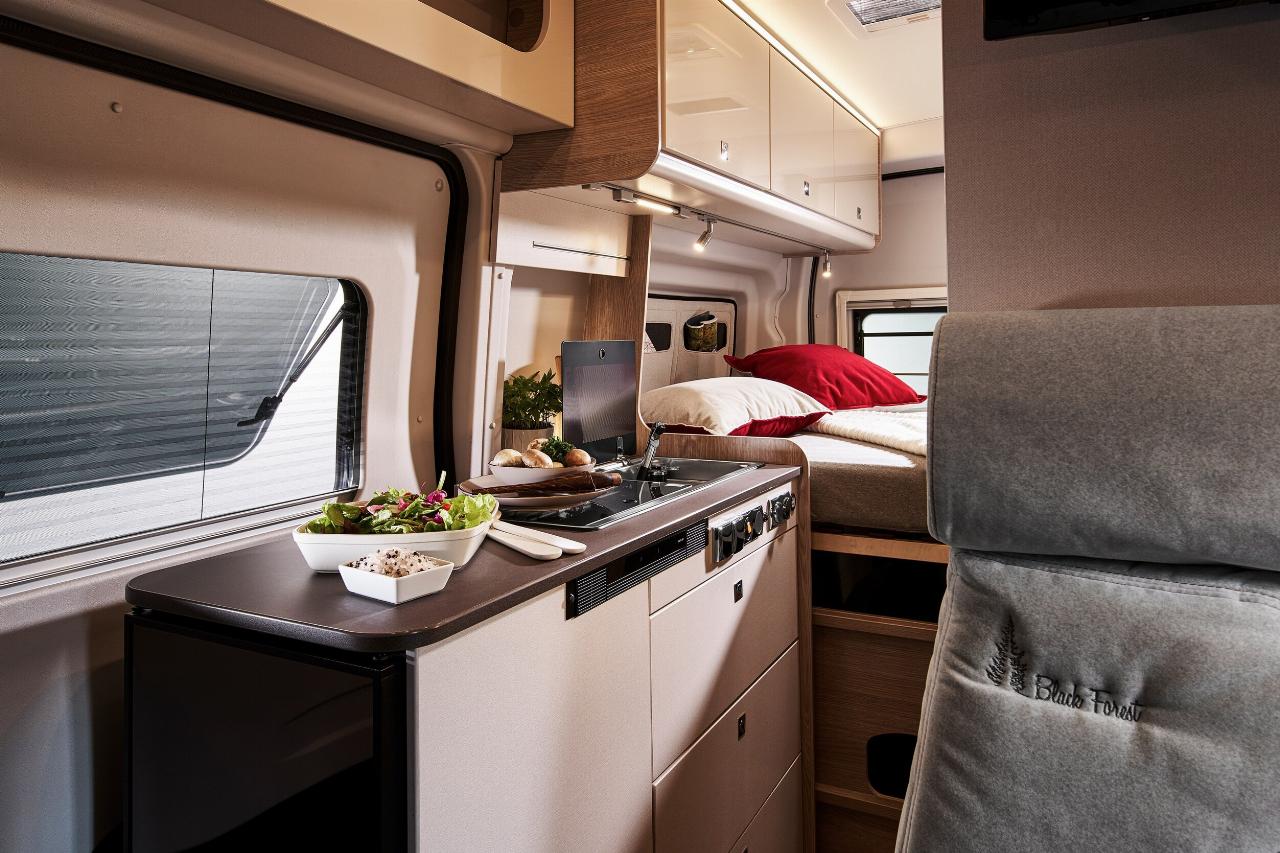 Zwei Grundrisse sind im Angebot, der Lineo C 590 und der Lineo C 550, beide rangieren in der Sechs-Meter-Klasse und haben großzügige Querbetten im Heck. Die Black Forst Edition setzt dabei auf ein eigenes Innenraumdesign mit speziellen Kissen und einem Spannbetttuch darauf. Dank des im unteren Küchenblock eingebauten Kühlschranks schafft die offene Blickachse ein gutes Raumgefühl, die Stehhöhe von fast zwei Meter erzeugt außerdem optische Weite.
