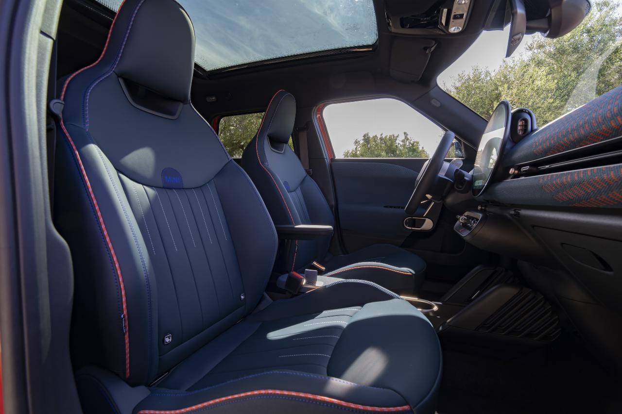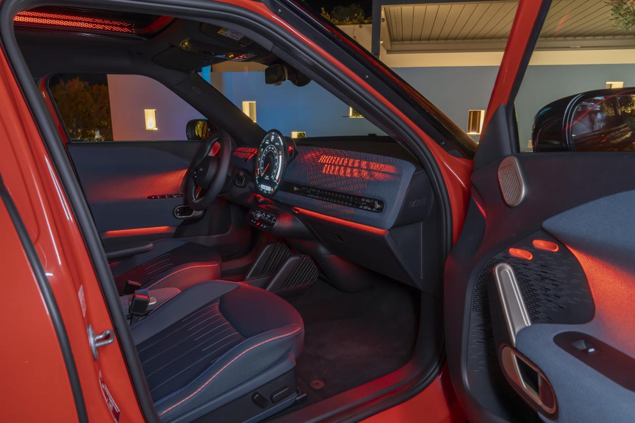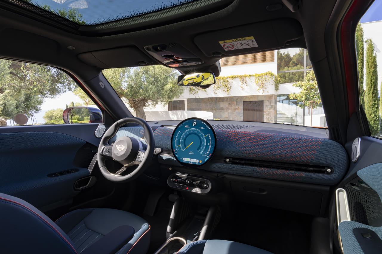 Man sitzt etwas höher als im Cooper, hat ein hübsches Lenkrad in der Hand, dessen untere Speiche aus einem Stoffband besteht. Ein weiteres Stoffband findet sich über dem Lenkrad und ist genauso sinnfrei wie die Lichtmuster, die auf das stoffbezogene Armaturenbrett projiziert werden. Schön anzusehen sind hingegen die Sitze, wahlweise mit Stoff oder Kunstleder bezogen. Oder, wie man heute sagt, mit veganem Leder.
