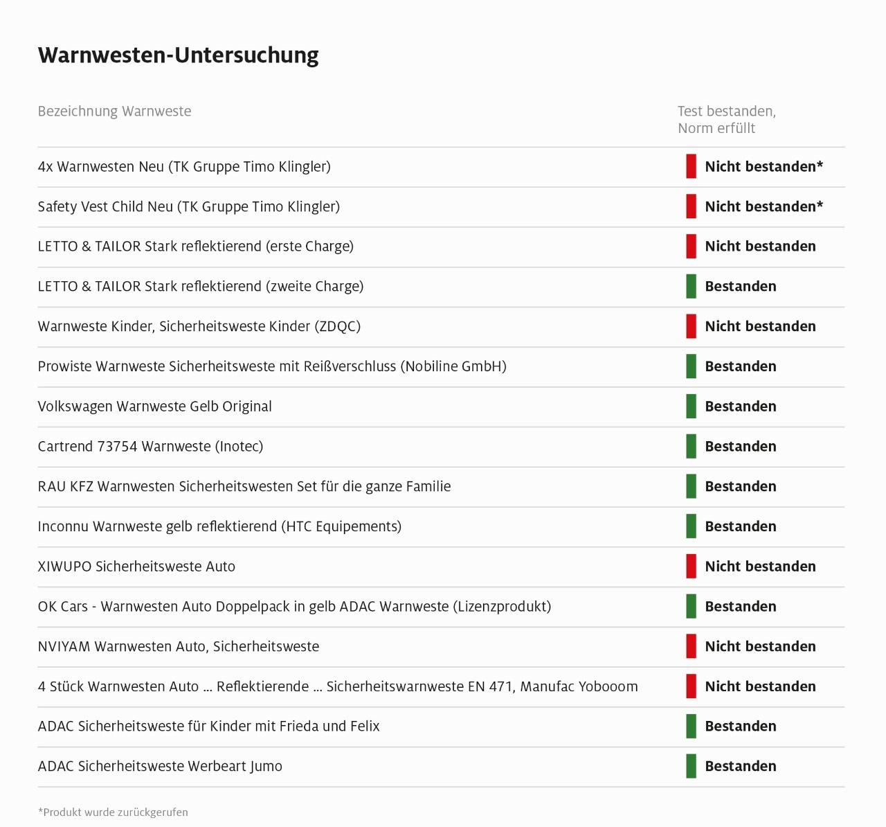 Der ADAC hat online 14 Westen, darunter Kinder- und Erwachsenenmodelle, beschafft und diese mit einem Prüfset einem ersten Schnelltest unterzogen: Dabei wurde die Warnweste neben eine Referenzkarte mit drei unterschiedlich guten Reflexionsflächen gelegt und angestrahlt. Erkannte der Prüfer, dass die Warnweste ähnlich hell reflektierte wie die reflexionsstärkste der drei Testflächen, war anzunehmen, dass sie die gesetzliche Norm für Warnwesten (EN ISO 20471) erfüllte. Das war bei neun der insgesamt 14 Modelle der Fall. Die restlichen fünf Westen erreichten die Norm nicht einmal näherungsweise, sie kamen sogar nicht einmal an die Leuchtkraft der schwächsten Referenzfläche heran, die eine Normunterschreitung darstellt.