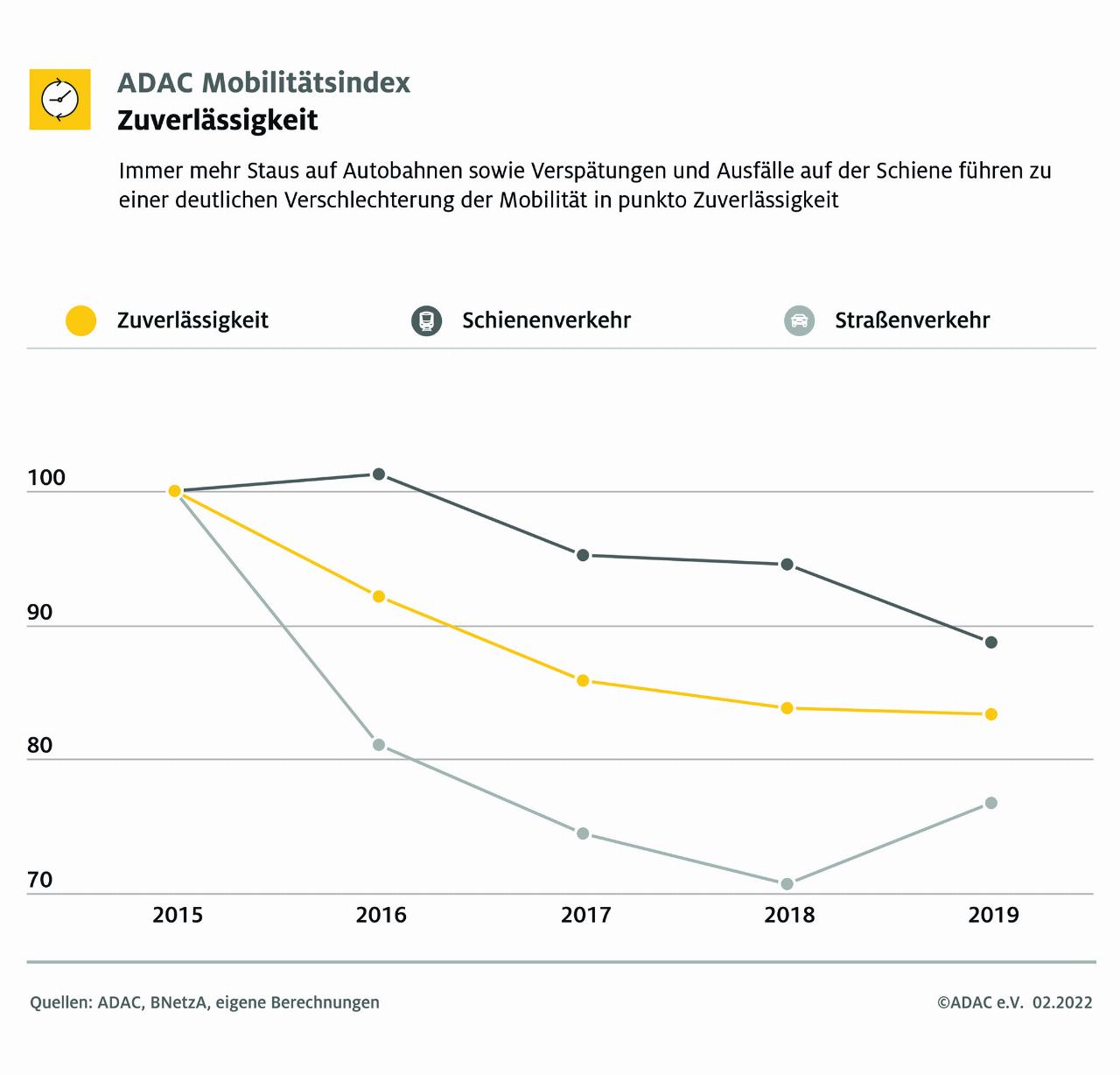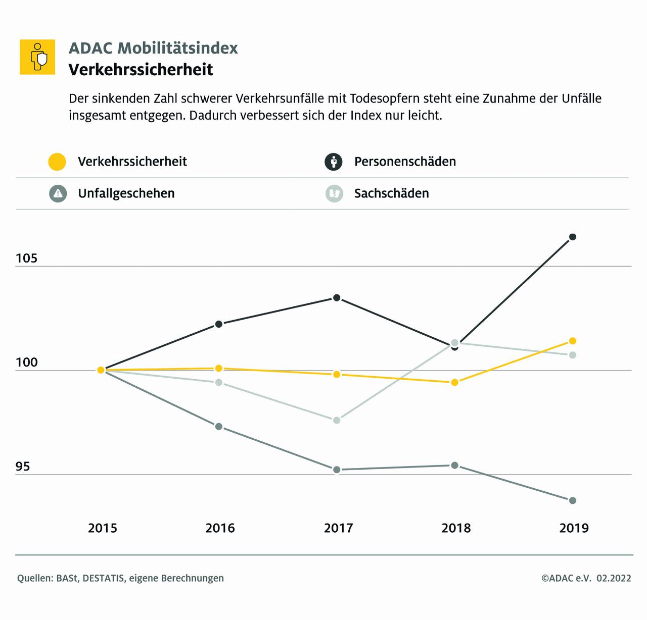 Bei der Verkehrssicherheit ist mit einem Teilindex von 101 nur eine leichte Verbesserung erkennbar. Zwar gibt es seit 2015 weniger Unfälle mit Personenschäden zu beklagen, gleichzeitig passierten insgesamt aber mehr Unfälle, wodurch die positive Entwicklung überlagert wurde. Hauptursache für fehlende Fortschritte im Zeitverlauf seit 2015 ist eine deutliche Verschlechterung des Faktors Zuverlässigkeit. Straßenstaus sowie Verspätungen und Ausfälle auf der Schiene führen dazu, dass dieser Teilindex auf 83 abfällt.