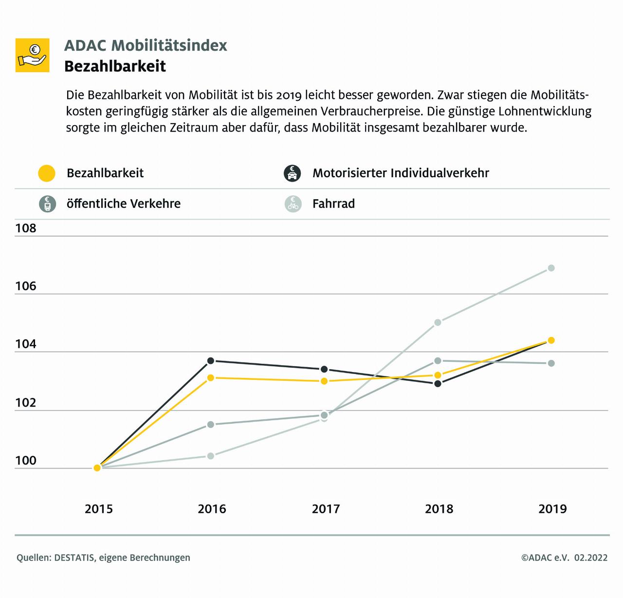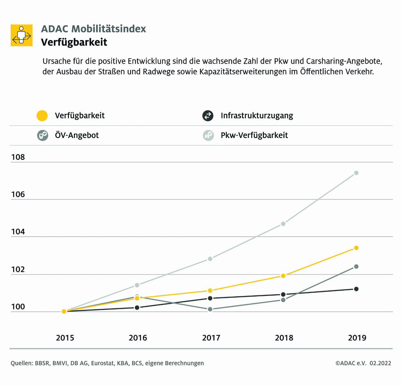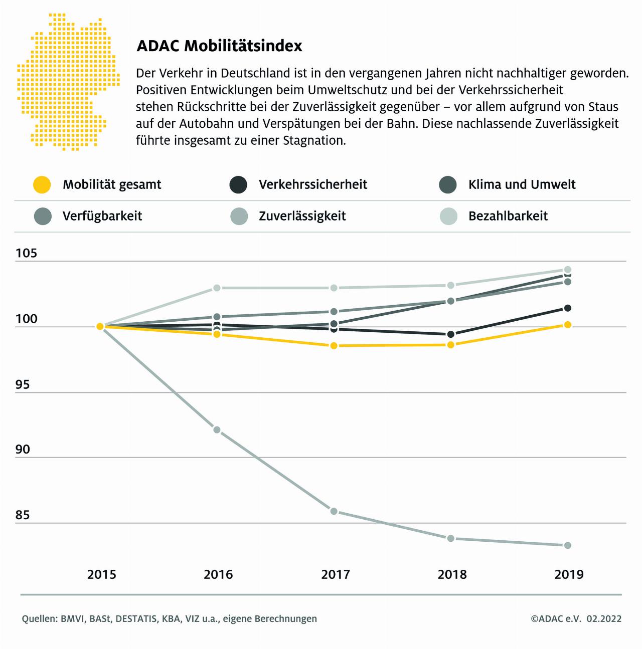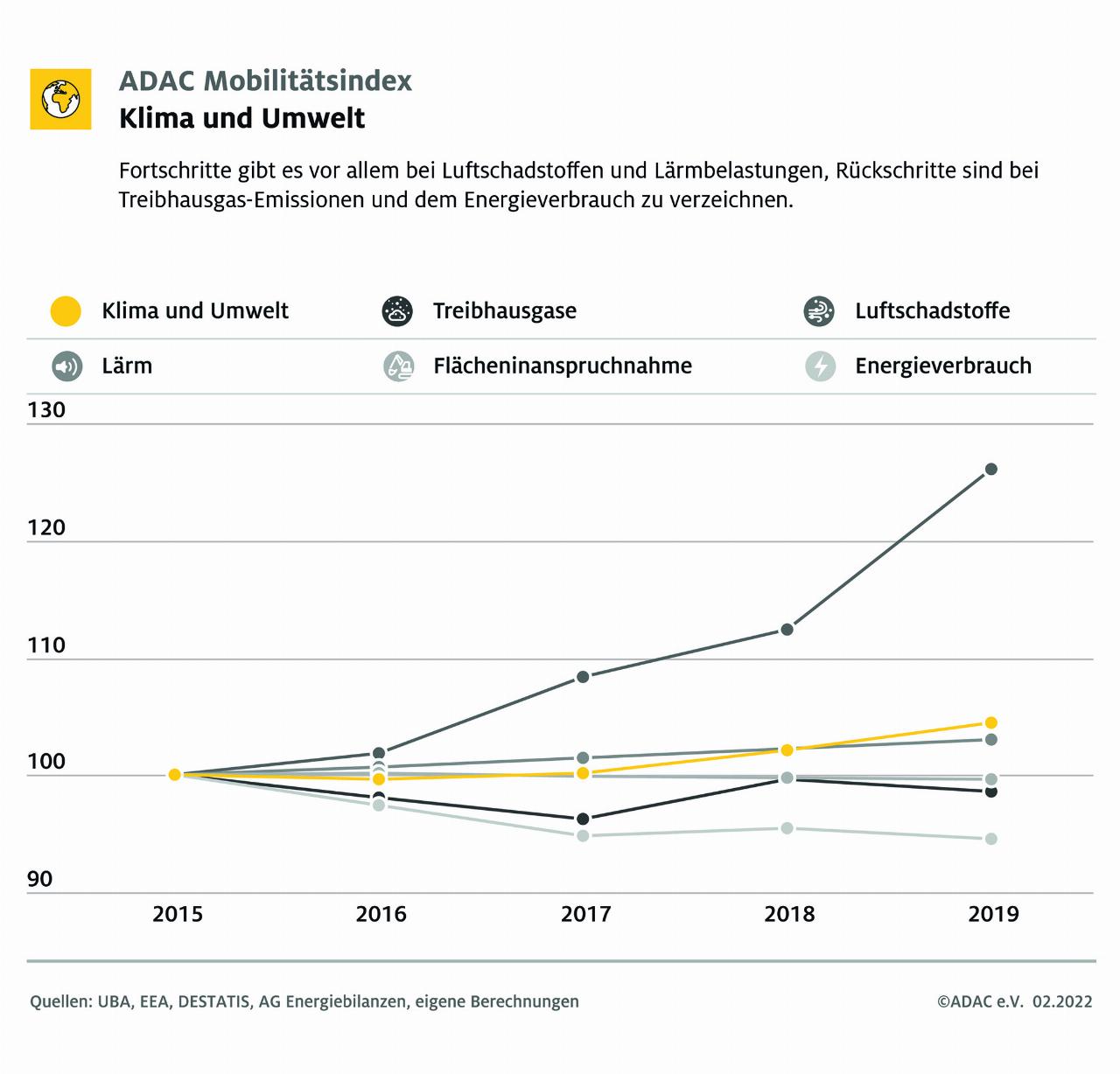 Der ADAC-Mobilitätsindex erfasst die Entwicklungen im Bereich der Mobilität anhand von 16 Leitindikatoren und weiteren 39 Indikatoren. Nachhaltigkeit wird dabei umfassend verstanden und berücksichtigt ökologische, wirtschaftliche und gesellschaftliche Aspekte. Dies wird durch die Punkte Verkehrssicherheit, Umwelt und Klima, Verfügbarkeit, Zuverlässigkeit sowie Bezahlbarkeit abgedeckt. Dabei zeigen sich im Bereich Klima und Umwelt seit 2015 Fortschritte. In dieser Bewertungsdimension werden unter anderem Treibhausgasemissionen, Luftschadstoffe, aber auch der Flächenverbrauch berücksichtigt. Der Teilindex kann sich hier auf 105 verbessern: Vor allem Luftschadstoffe und Lärmbelastungen konnten reduziert werden, während die Treibhausgasemissionen nicht gemindert wurden.