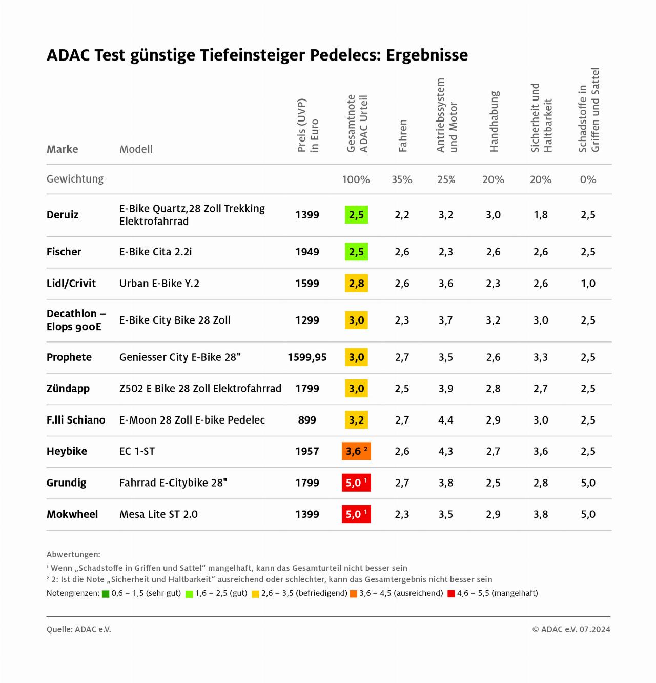 Testverlierer sind die Pedelecs von Grundig und Mokwheel – in beiden wurde der Weichmacher DEHP (Diethylhexylphthalat) gefunden (bei Mokwheel im Griff und im Sattel bei Grundig), der als fortpflanzungsgefährdend gilt. Das „mangelhaft“ in dieser Einzelkategorie schlägt auf das Gesamturteil durch. Weitere Schwächen sind der lange Nachlauf des Motors (Mokwheel), gepaart mit einer fehlenden Abschaltautomatik beim Bremsen. Dass es auch völlig ohne Schadstoffe geht, beweist das Crivit-Modell von Lidl, das als einziges Rad im Testfeld keine Schadstoffe in Griff und Sattel hat.
