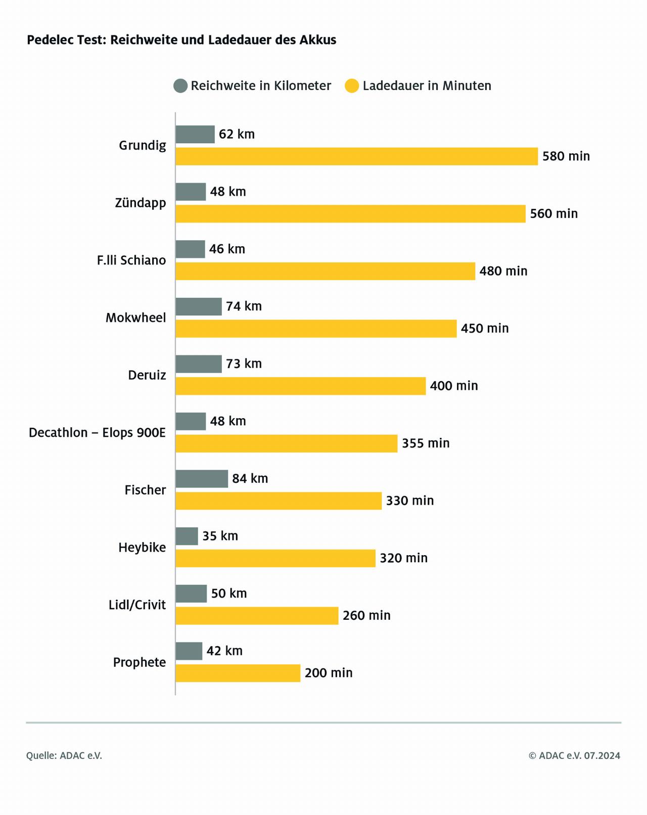 Untersucht wurden die E-Bikes hinsichtlich Fahreigenschaften, Motor, Handhabung, Sicherheit und Schadstoffen. Deutliche Unterschiede gab es vor allem bei der Bremsleistung, der Unterstützung des Motors und der Ergonomie. Testsieger mit Note 2,5 sind das Deruiz Quartz und das Fischer Cita 2.2i. Das Deruiz überzeugt mit leistungsfähigen Bremsen und erlaubt mit einer Reichweite von 73 Kilometern (Prüfstand) auch einen Tagesausflug. Die Schaltung harmoniert nach Einschätzung des ADAC gut mit dem Antrieb, auch wenn die Unterstützungsmodi etwas feiner abgestuft sein könnten. Das Rad von Fischer ist das einzige Pedelec im Test mit Mittelmotor. Der drehmomentgesteuerte Antrieb sowie die aufrechte und dank Sattelfederung komfortable Sitzposition sorgen für ein angenehmes Fahrverhalten, mit 84 Kilometern kommt es sogar noch weiter als das Deuriz. Die Leistung in der höchsten Unterstützungsstufe dürfte allerdings etwas stärker sein und auch der der Informationsumfang auf dem Display ist verbesserungswürdig, so das Urteil.