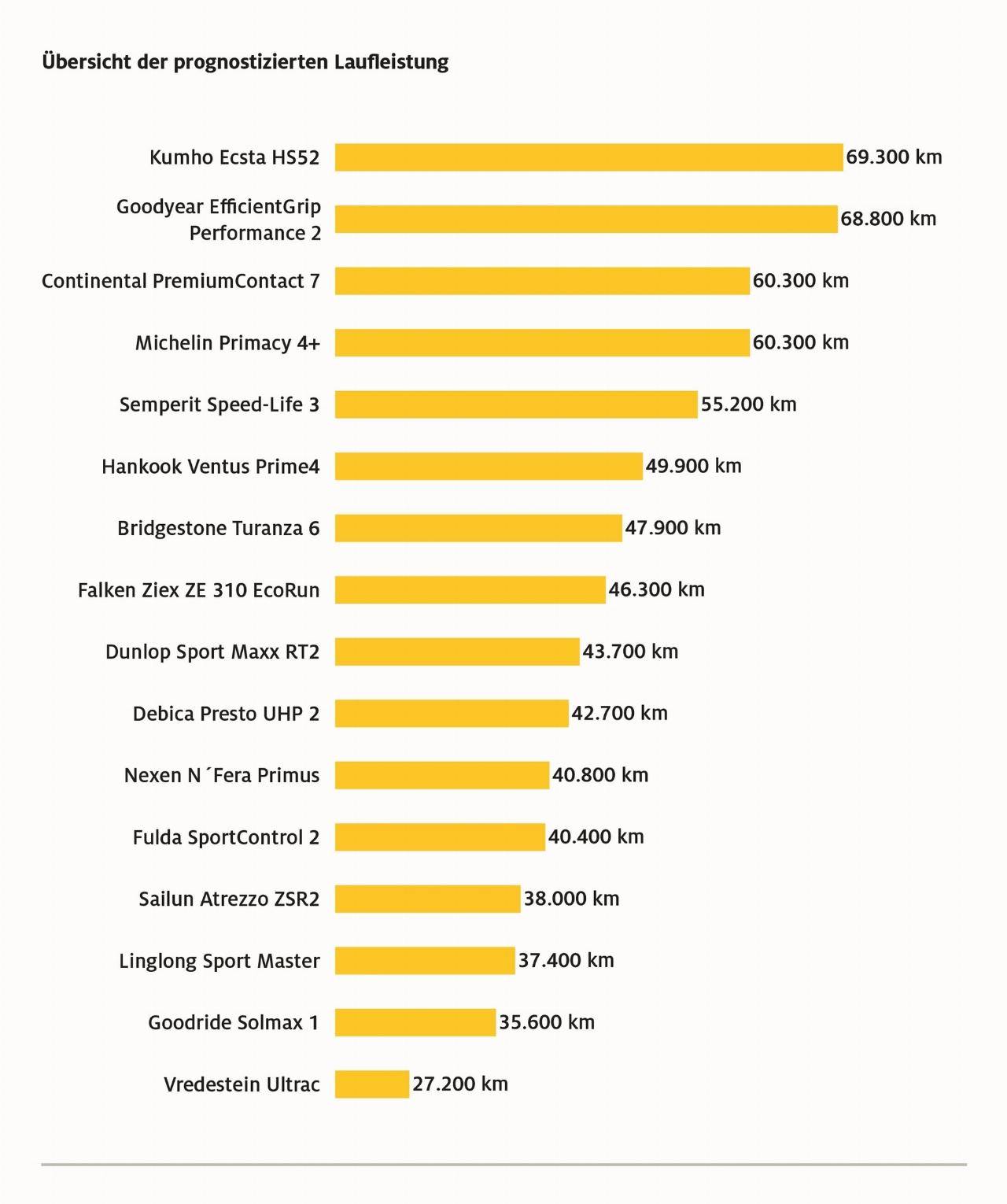getestete Continental Premium Contact 7 setzt hier neue Maßstäbe und fährt auf den Spitzenplatz. Als einziger Reifen kann sowohl in Sachen Fahrsicherheit als auch in der im vergangenen Jahr neu eingeführten Umweltbilanz aber der Michelin Primacy 4+ überzeugen. Er überzeugt durch den geringen Reifenabrieb, niedriges Gewicht und geringen Rollwiderstand. Zusammen mit den guten Noten für die Fahrsicherheit schafft er es auf den zweiten Rang und bekommt als einziger Reifen im Test die Auszeichnung „Umweltschonender Reifen“. Die Fahrsicherheit macht 70 Prozent der Gesamtnote aus, die Umweltbilanz 30 Prozent. Der Kumho überzeugt mit guten Fahreigenschaften für relativ wenig Geld, verpasst aber wie der Continental knapp eine gute Note bei der Umweltbilanz.