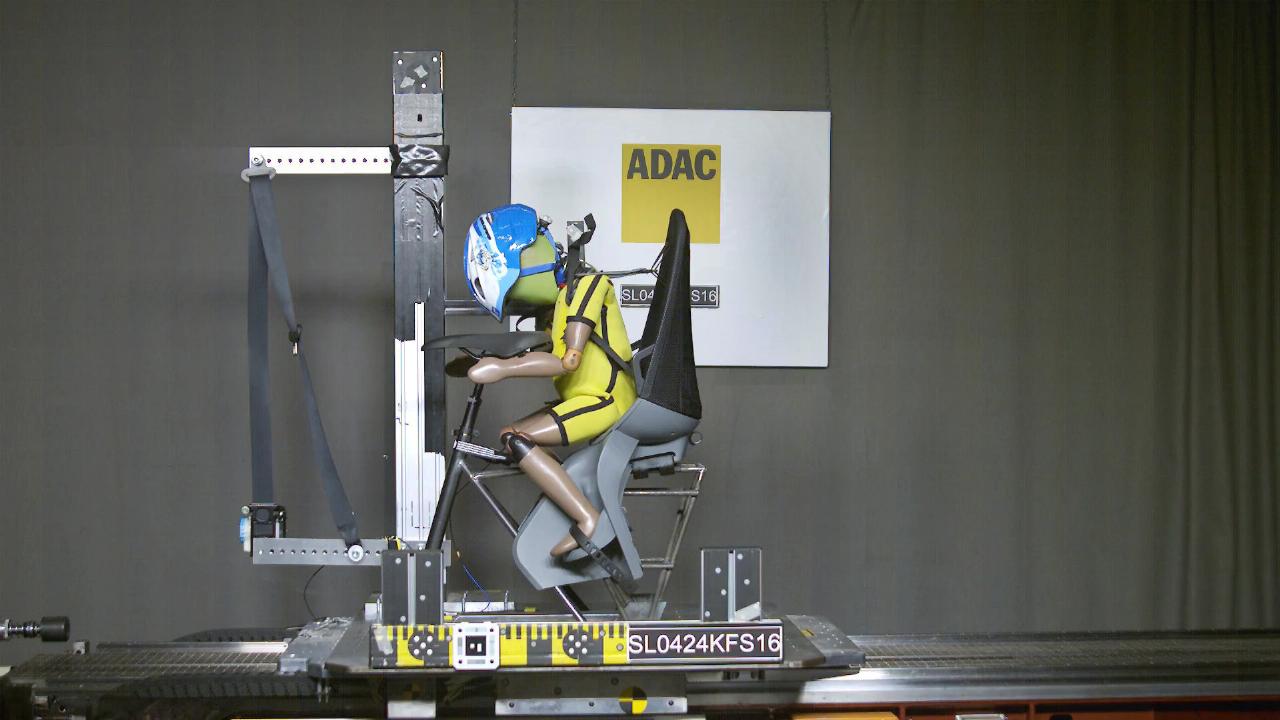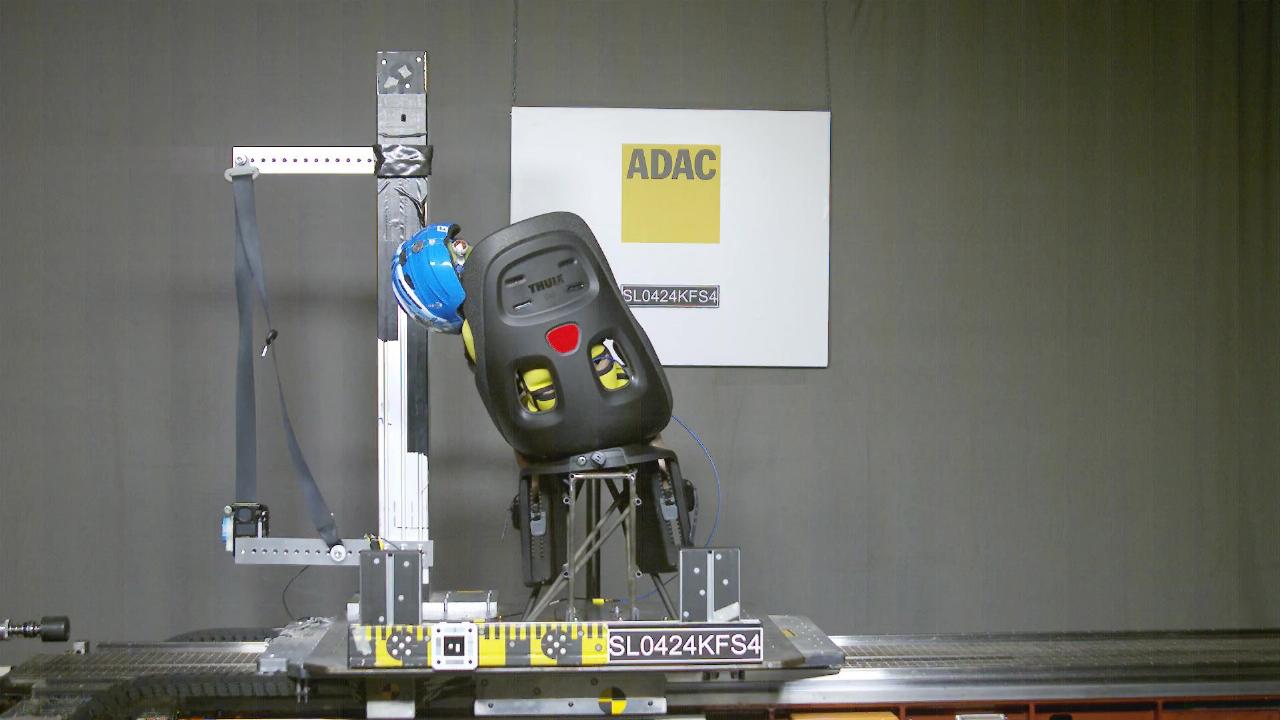 Erstmals mussten sich die Kinderfahrradsitze beim ADAC-Test auch in einem Seiten- sowie Frontcrash stellen – in typischen Unfallszenarien also, wenn ein Auto seitlich mit einem Fahrrad kollidiert oder ein Rad auf einen Pkw auffährt. Die Kindersitze, in denen jeweils ein Kleinkinderdummy saß, meisterten die Versuche unterschiedlich gut, manche hielten den Stößen stand, bei anderen brach die Halterung oder barst das Plastik der Sitzschale. Beides erhöht das Verletzungsrisiko, wenn sich dadurch der Kinderfahrradsitz vom Fahrrad löst.