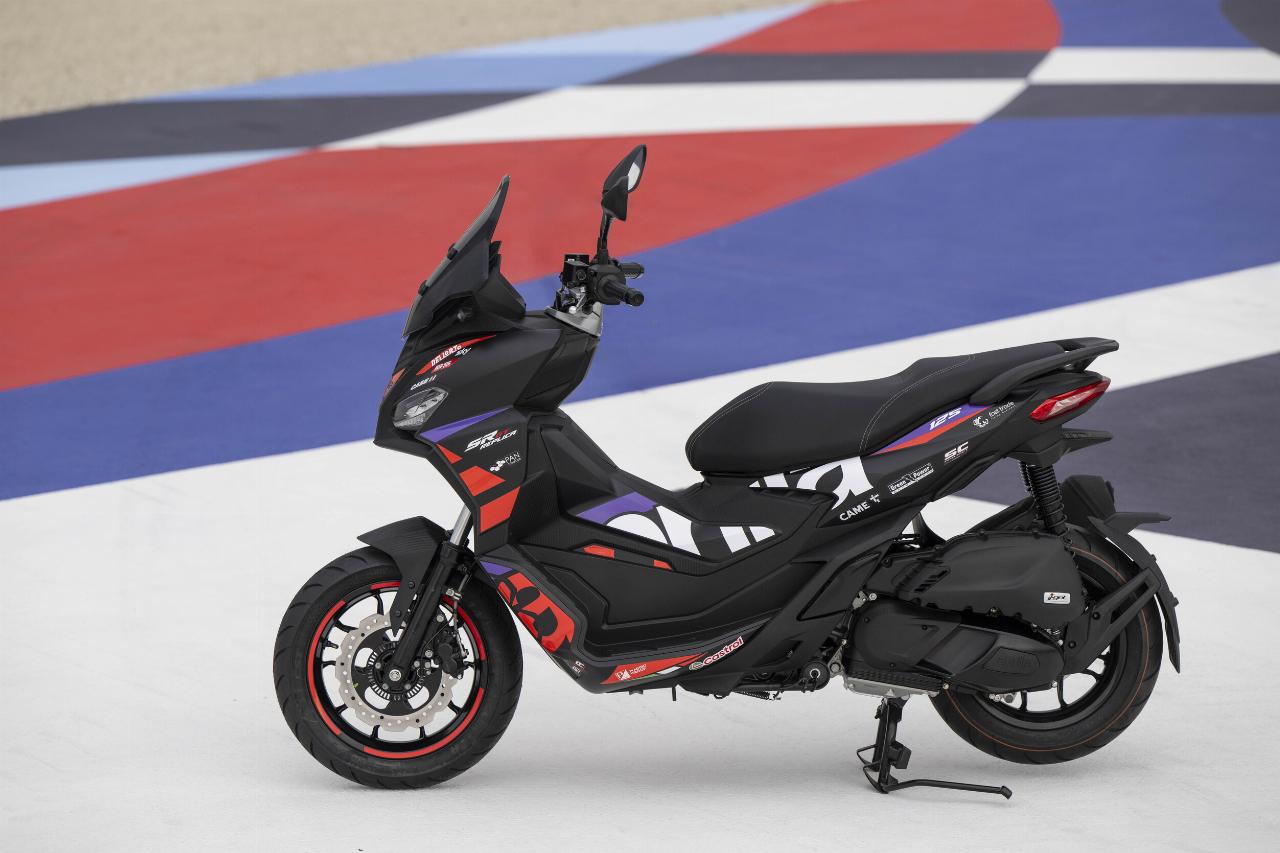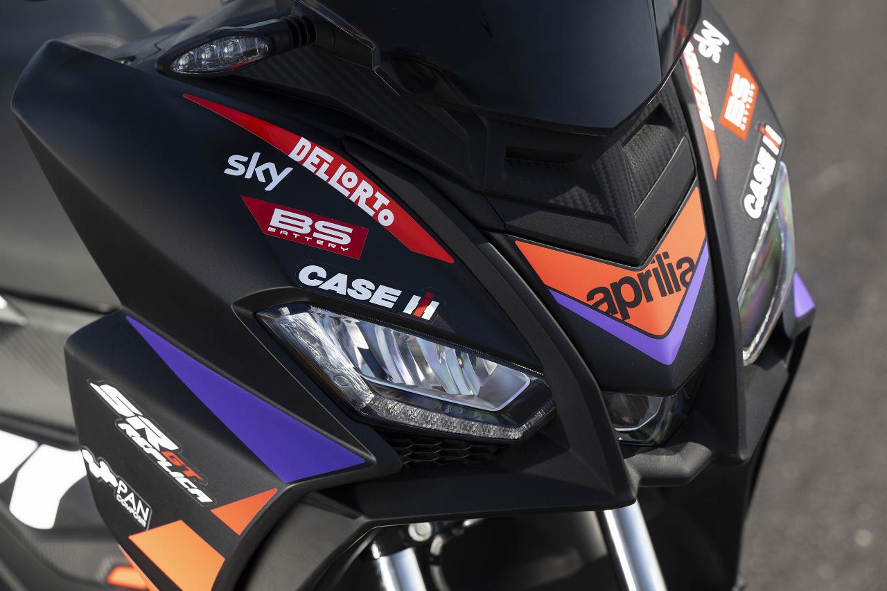 Eigentlich ist der Aprilia SR GT ja laut Marketing ein „Urban Adventure“-Scooter. Nun kommt der Motorroller als „Replica“ in den Farben der Rennmaschinen von Aleix Espargaró und Maverick Vinales in der aktuellen Moto-GP-Saison. Merkmale sind die mattschwarze Farbgebung mit roten und violetten Grafiken sowie der Markenschriftzug, der sich entlang der Seite und des Mitteltunnels bis zum vorderen Teil des Trittbretts hinzieht. Ebenso wie der Mitteltunnel ist auch der Soziusgriff in Mattschwarz ausgeführt, während das Felgenband vorne rot ist. Dazu kommen Sponsorenaufkleber und – beigelegt – die beiden Startnummern der Moto-GP-Motorräder zum Selbstanbringen. Statt der Allterrain-Räder gibt es Reifen mit sportlichem Straßenprofil.