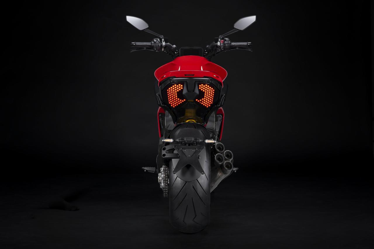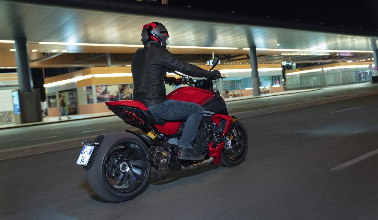 Auch die Diavel V4 verfügt über die neue Zylinderabschlaltung im Fahrbetrieb. Es gibt neue LED-Lichter und einen näher zum Fahrer gerückten Lenker. Die Anhebung des hinteren Federwegs um anderthalb Zentimeter soll den Fahrkomfort verbessern. Geblieben ist der mächtige 240/45er-Hinterrreifen.