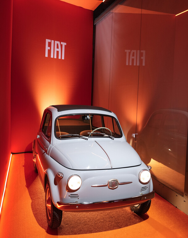 Olivier François, CEO Fiat und Global CMO der Stellantis Gruppe, François Leboine, Head of Design Fiat und Giorgetto Giugiaro, Vorsitzender des Designstudios GFG Style Olivier François hatten die Ausstellung im Hotel Magna Pars, im Herzen des Mailänder Mode- und Designviertels, eröffnet. Ciao Futura wird eingerahmt von zwei legendären Oldtimer: einem Fiat 500 aus dem Jahr 1957 und einem Fiat Panda aus den 1980er Jahren. In die Gegenwart führt der aktuelle Fiat Topolino Corallo, in die Zukunft der noch nicht erhältlichen Fiat Topolino Sport Edition. (aum)
