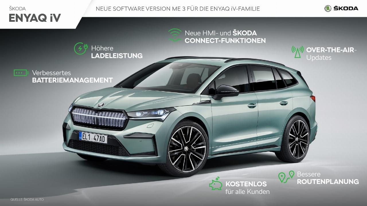 Skoda installiert ab sofort die Software-Version ME3 für bereits ausgelieferte Skoda Enyaq iV. Das Update ermöglicht über ein verbessertes Batteriemanagement eine höhere reale Reichweite und zahlreiche Anpassungen beim Cockpit, dem Head-up-Display, dem Infotainmentsystem und der Online-Dienste von Skoda Connect. Die Kunden werden von ihrem lokalen Skoda Partner für einen kostenlosen Servicetermin kontaktiert.
