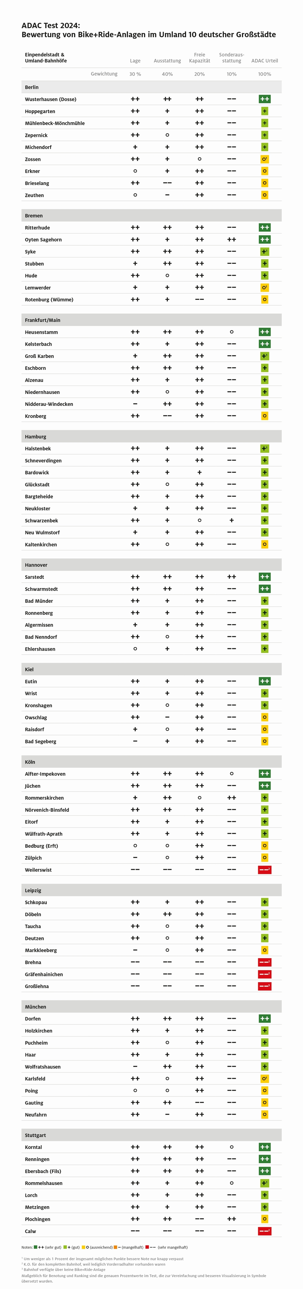 Der ADAC hat die Anlagen außerhalb der Ferien im Zeitraum von April bis Juni 2024 von Dienstag bis Donnerstag jeweils von 9 bis 16 Uhr getestet. Untersucht wurden Einzugsorte von Pendlerinnen und Pendlern aus dem Umland der zehn größten deutschen Städte (eine Stadt pro Bundesland): Berlin, Bremen, Frankfurt, Hamburg, Hannover, Kiel, Köln, Leipzig, München und Stuttgart. Zu den Testkategorien gehörten Lage, Ausstattung, freie Kapazitäten und Sonderausstattung. (aum)