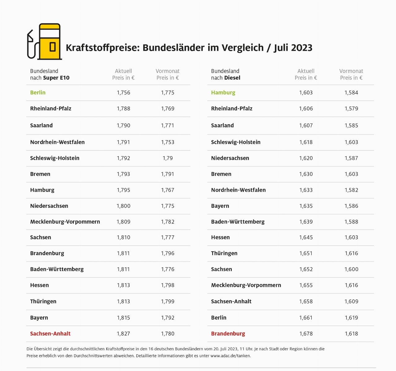 In Berlin kostet ein Liter Super E10 im Mittel 1,756 Euro, in Sachsen-Anhalt hingegen 1,827 Euro und damit 7,1 Cent mehr. Dieselfahrer bezahlen in Hanmburg im Schnitt 1,603 Euro für den Liter, in Brandenburg liegt der Preis mit 1,678 Euro 7,5 Cent höher. Dass Berlin bei Diesel das zweitteuerste Bundesland ist, bei Benzin jedoch das günstigste, zeigt, dass es für beide Kraftstoffsorten unterschiedliche Märkte gibt, auf denen sich die Preise in verschiedene Richtungen entwickeln können.