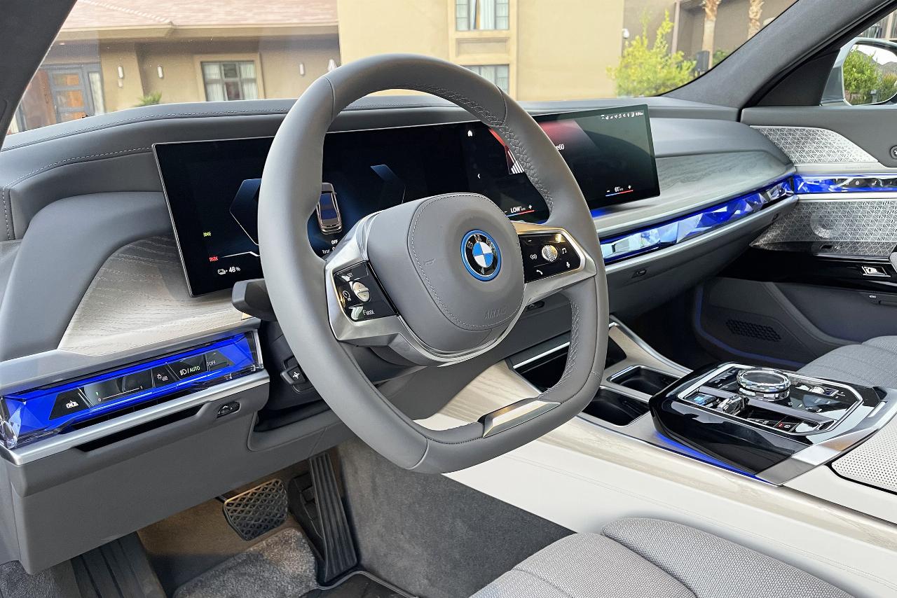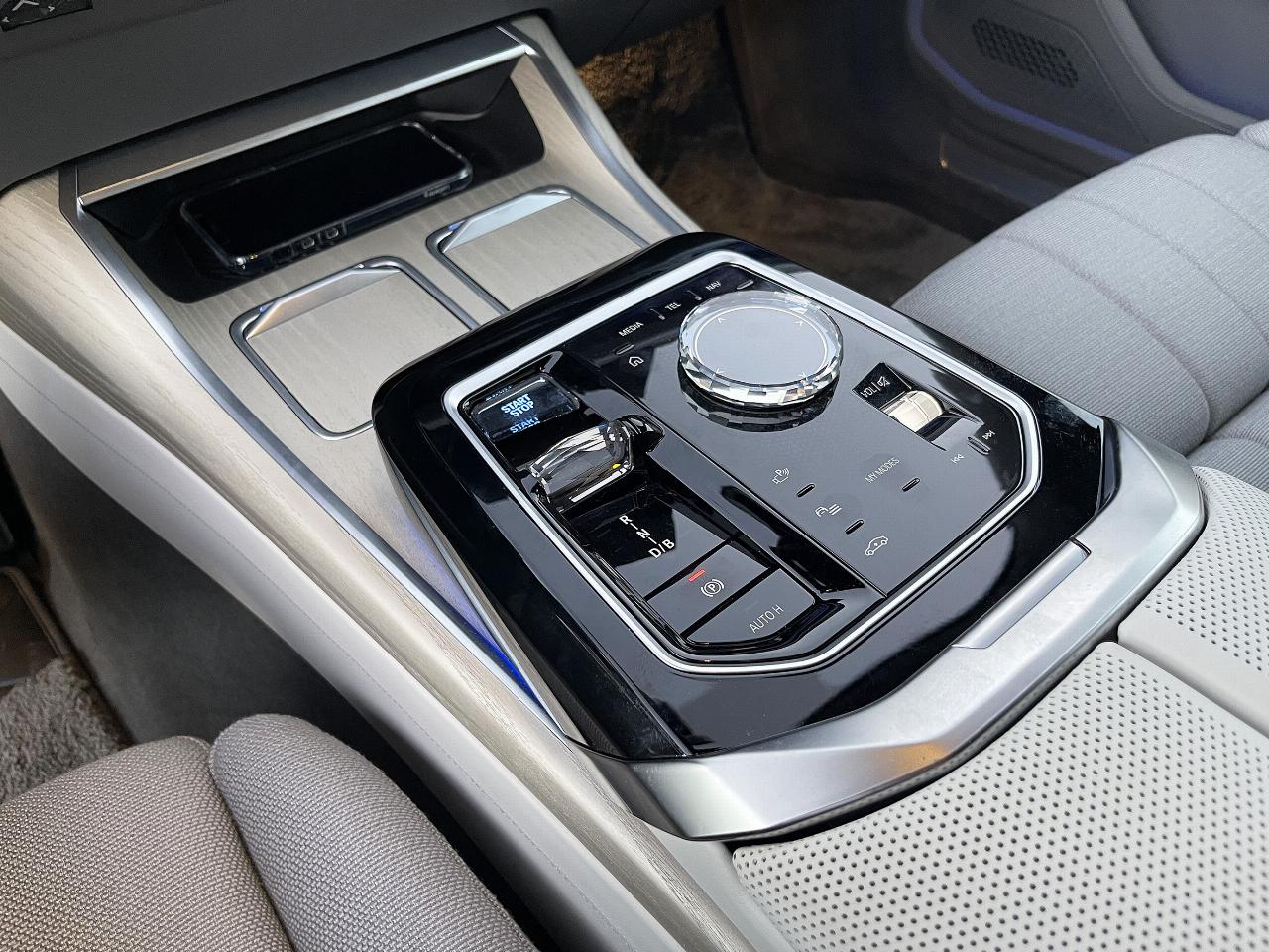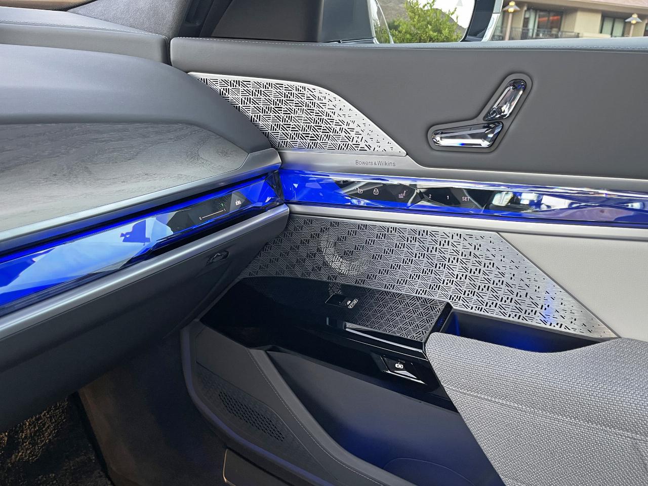 Der als „Interaction Bar“ bezeichnete Lichtstreifen in Kristalloptik am Armaturenbrett und der 31 Zoll große „Theaterscreen“-Bildschirm im Fond sind die wohl auffälligsten Elemente in diesem Auto. Das alles wirkt sehr klar und aufgeräumt. Für die elektronikaffine Klientel sind, vom neuen BMW Operating System 8 unterstützt, vielfältige weitere Funktionen an den Bildschirmen zu erkunden. Angenehm finden wir, dass der Automatikschalthebel gegen einen Kippschalter ersetzt wurde, denn Ladeschale und Becherhalter sind nun ungestört zugänglich.