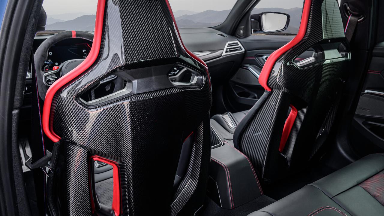 Die Fahrdynamikregelung, Stoßdämpfer, Bremsen und Lenkung sind noch sportlicher als beim regulären M3 Competition, das Felgendesign ist CS-spezifisch, genauso wie die Felgenfarbe Goldbronze. Besonders auffällig sind die Karosserieelemente aus Kohlefaser, darunter Frontsplitter, Heckschürze, Lufteinlässe, Außenspiegelkappen und die Motorhaube. Auch im Interieur kommt das teure Leichtbaumaterial zum Einsatz, unter anderen bei den serienmäßigen Schalensitzen. Das CS-Logo in den Kopfstützen ist beleuchtet, ihre Lederbezüge sind ebenfalls modellspezifisch.