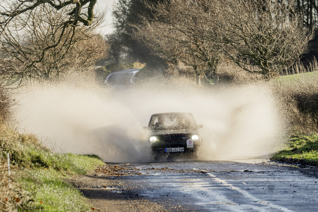 Der Draisinen-Bulli ist nur eine Rarität, die der Volkswagen-Konzern in diesem Jahr in Bremen zeigt. Eine andere ist der Ur-Golf-GTI. Der „Sport-Golf“, der 1976 debütierte, feiert in diesem Jahr 50. Geburtstag. Allein die erste Generation des Golf GTI verkaufte sich mehr als 460.000-mal. VW stellt deshalb ein GTI-Duo der ersten Generation, die bis 1983 von Band lief, in den Vordergrund: Einerseits einen herausgeputzten Serien-GTI aus dem Jahr 1979 in leuchtendem „Marsrot“. Zum anderen einen GTI aus dem Jahr 1983, der deutliche Gebrauchsspuren zeigt. Das ist kein Zufall, sondern das Ergebnis der Reise, die der Wagen soeben hinter sich brachte. Das Modell nahm an der einer der härtesten Oldtimer-Rallyes überhaupt teil: LeJog. Bei dem Rennen geht es 2400 Kilometer über Stock und Stein und durch zahlreiche Bäche in Großbritannien. Und in exakt dem Zustand, in dem der GTI die Ziellinie überquerte, steht er nun in Bremen.