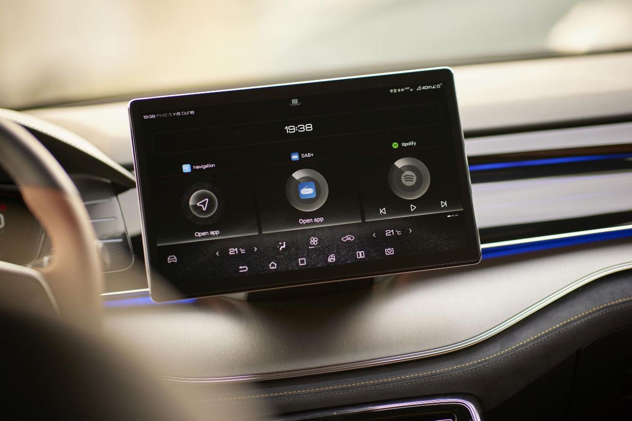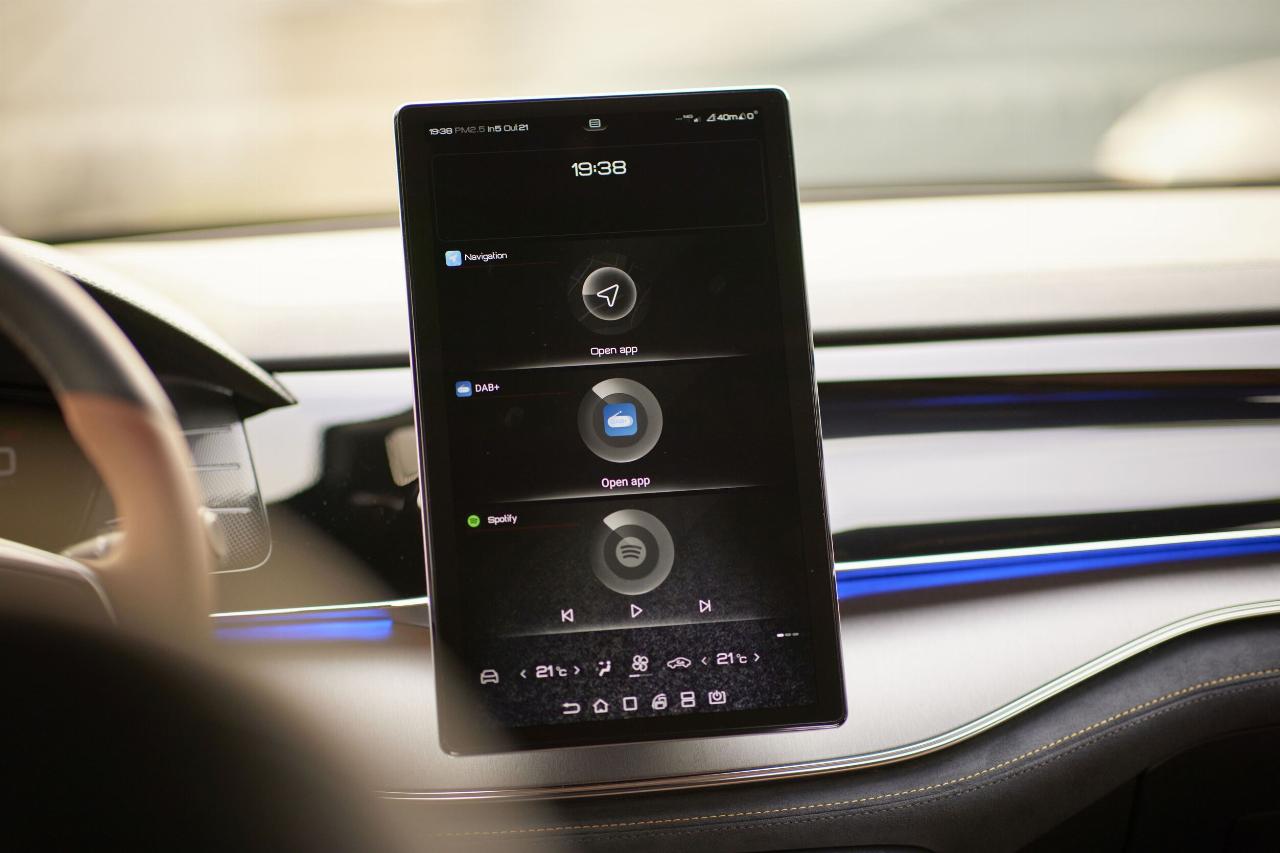 Im großzügig ausgelegten Innenraum durften sich die Designer etwas vom Üblichen lösen, ohne allerdings zu verspielt zu werden. Der je nach Version zwischen 12,8 und 15,6 Zoll große berührungsempfindliche Bildschirm lässt sich aus seiner horizontalen Position in die Vertikale drehen – das ist bisher einmalig, und die Lüftungsdüsen wirken leicht futuristisch. Drei Kordeln in den Türseiten mutieren bei Berührung zu Gitarrensaiten, wobei der Ton über die Lautsprecher noch verstärkt wird. Die Materialien sind hochwertig und bestens verarbeitet und lassen eine Wohlfühl-Atmosphäre entstehen.