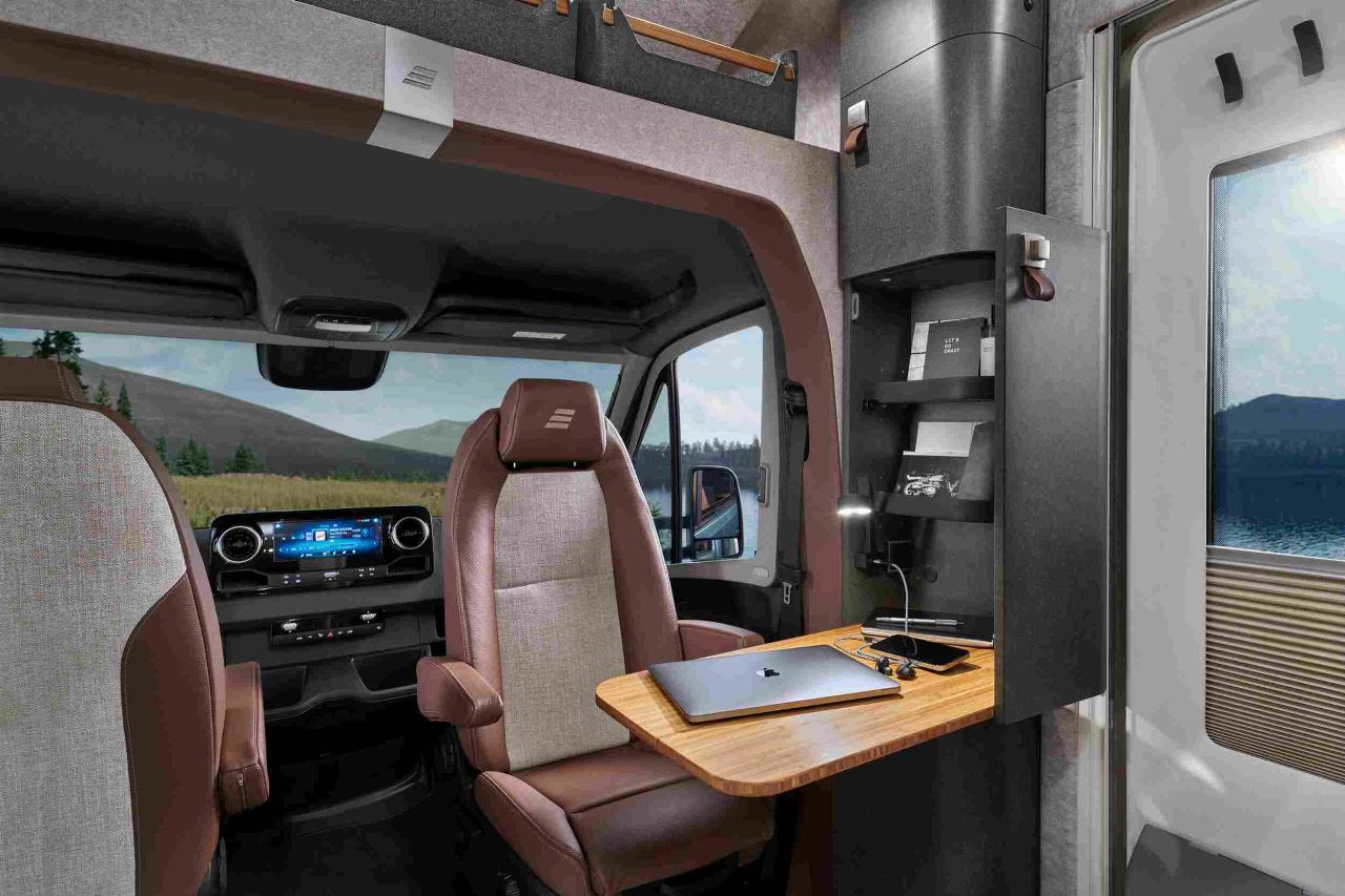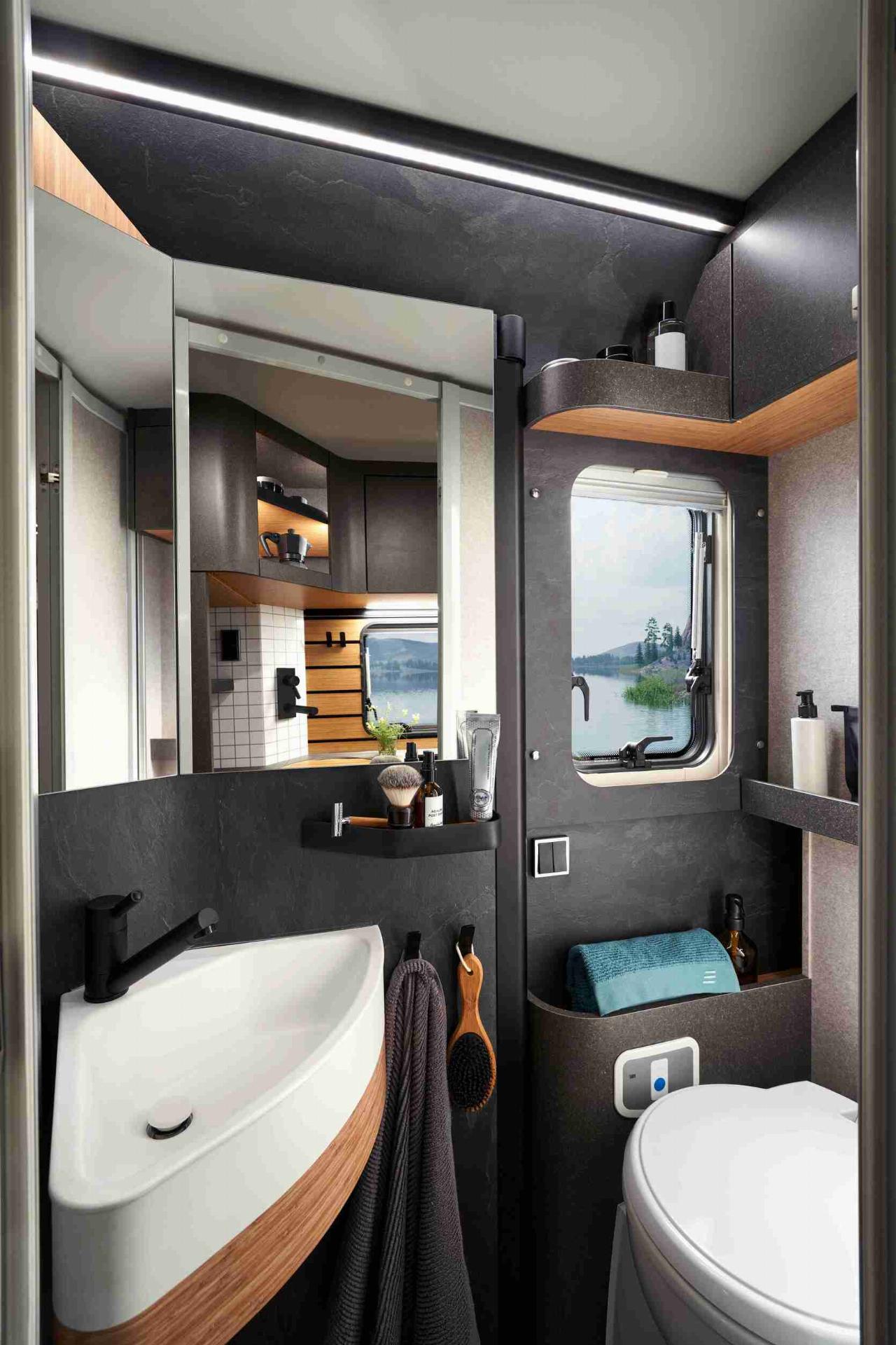 Die Pantry ist mit einem edlen Zweiflammen-Gaskocher ausgestattet, der Kühlschrank arbeitet nach dem Kompressorsystem. Gegenüber gib es einen variablen Waschraum, dessen Stirnwand sich verschieben lässt, um Platz für die Dusche zu machen. Ein schwenkbares Kunststoffelement teilt dann die Kassettentoilette ab. Auf der anderen Seite, zwischen Treppe und Fahrersitz, ist ein kleiner Arbeitsbereich mit Tischplatte angeordnet, denn der Venture S soll auch als mobiles Büro gute Dienste leisten. Dafür gibt es auf Wunsch an Bord ein schnelles WLAN, um mit der Geschäftswelt in Verbindung bleiben zu können.