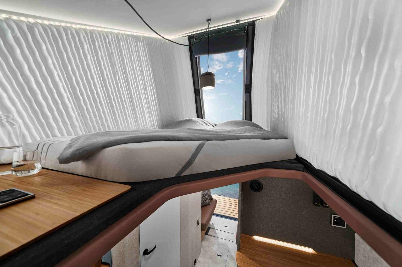 Im Heck findet sich eine Face-to-Face-Sitzgruppe mit Lounge-Charakter und einem klappbaren Tisch, der bei Bedarf zusammen mit den beiden Sitzbänken zum Bett für zwei wird. Das eigentliche Schlafzimmer findet sich jedoch in der zweiten Etage. Das Dach kann pneumatisch aufgestellt werden, die luftgefüllten Wände seitlich und vorn bilden eine Art Alkoven und sollen für ausgezeichnete Isolationswerte sorgen. Ein Doppelbett mit gut zwei Metern Länge verspricht unterdessen guten Schlafkomfort. Hinauf geht es nicht über eine Leiter sondern eine bequeme Treppe, die sich über den Küchenblock schwingt und in deren Stufen reichlich Stauraum aufs Befüllen wartet.