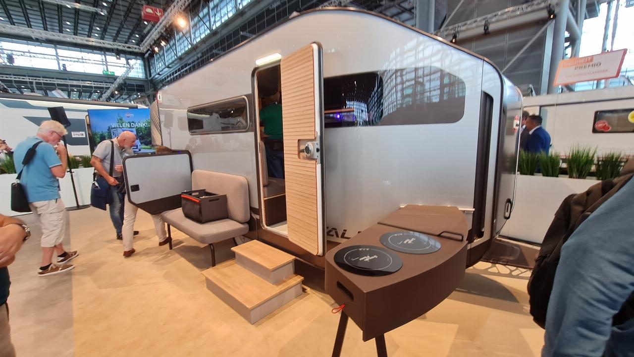 Die Möbel im Innenraum sind flexibel nutzbar. So lässt sich die Küchenplatte mit zwei Induktionskochfeldern herausnehmen und an der Außenwand befestigen. Bedeckt von einer möglichen Markise kann so auch bei weniger guter Witterung im Freien gekocht werden. Auch die Bank der Dinette lässt sich mit wenigen Handgriffen entriegeln und nach draußen schaffen, wo sie als bequeme Sitzgelegenheit dient. Beide Möbelteile sind dank konsequenten Leichtbaus sehr einfach zu tragen. Ohnehin ist der Talis ein Leichtgewicht und bringt nicht mehr als 900 Kilogramm auf die Waage. Was ihn zum idealen Anhänger für Elektroautos macht. Über eine Serienproduktion will Bürstner nach der Resonanz auf dem Caravan Salon entscheiden.