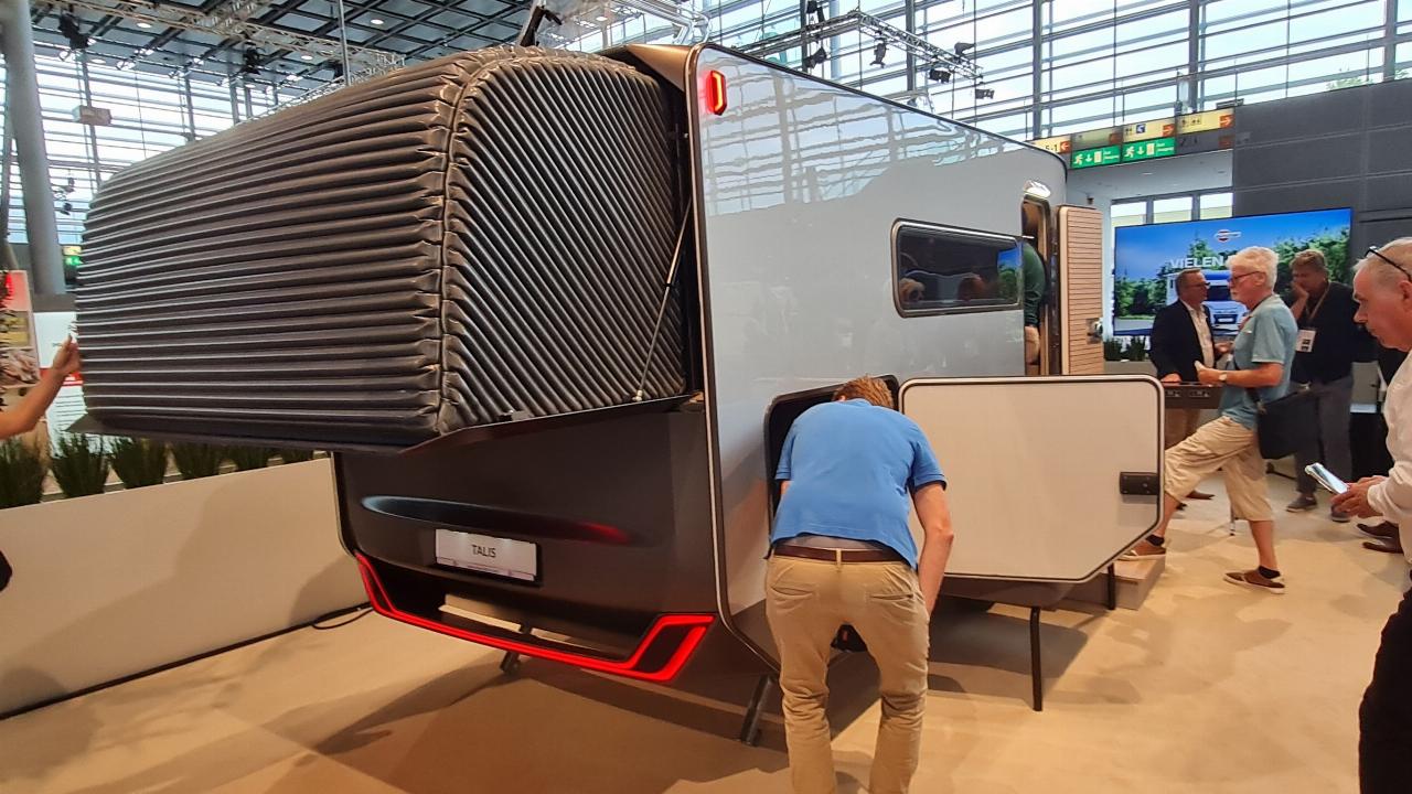 Das könnte sich ändern, wenn er wieder in den Fokus neuer Entwicklungen und Innovationen gerückt wird. Bürstner zeigt gerade in Düsseldorf, wie das funktionieren könnte und präsentiert die Caravan-Studie Talis. Der rund sechs Meter lange Anhänger macht sich mit einem schlanken, vorne konisch zulaufenden Aufbau zum Blickfang. Hinter der großen Klappe am Bug verbirgt sich ein Stauraum, am Heck verjüngt sich die Form des Caravans wieder, so dass möglichst wenige bremsenden Verwirbelungen entstehen. Im hinteren Bereich gibt es einen weiteren, großen Stauraum.