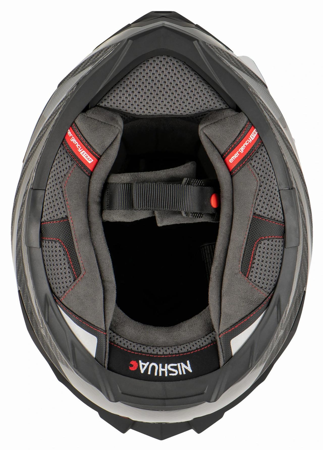 Die Abrisskante oben und der Nackendiffusor weisen ihn als Sporthelm aus. Das gilt auch für den klassischen Doppel-D-Verschluss und die Visiersperre. Der Nishua NRX-3 verfügt über ein Pinlock-Innenvisier und ein herausnehmbares sowie waschbares Innenfutter. Das Emergency-Strap-System erleichtert die Abnahme des Helms nach einem Unfall.