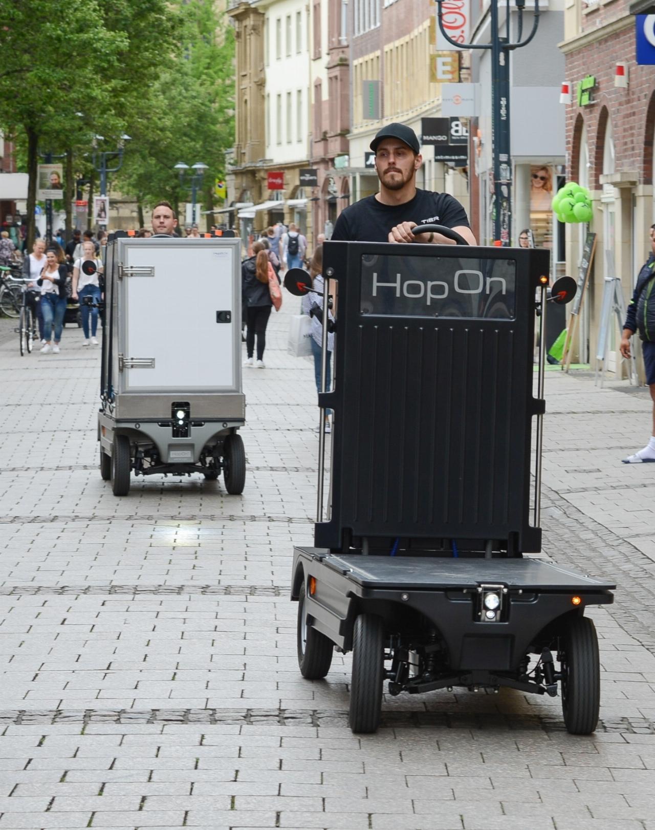 Der Steuerstand lässt sich zusammenklappen, so dass der 84 Zentimeter schmale und dann nur noch 60 Zentimeter hohe Hop On laut Hersteller auch in einem Kastenwagen mitgenommen werden kann. Je nach Batteriebestückung verspricht der Hersteller Reichweiten zwischen 25 und 90 Kilometern. Wahlweise kann ein Motor mit 1,7 kW (2,5 PS) oder 3,0 kW (4 PS) bestellt werden.
