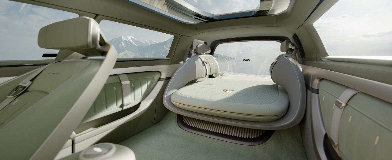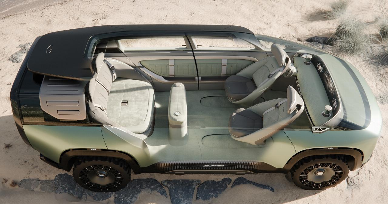 Das Fahrzeug mit höhenverstellbarer Luftfederung hat eine bewegliche Instrumententafel und verschiebbare 180-Grad-Vordersitze sowie eine gläserne Heckklappe. Die Rücksitzbank kann 40 Zentimeter weit ausgefahren werden. Darüber erstreckt sich eine große Panoramascheibe. Der loungeartige Innenraum des Concept-Cars hat einen mit Wildleder bezogenen Boden. Außerdem gibt es einen multifunktionalen, modularen Frontkofferraum, der variable Sitzbänke, eine mobile Küche und einen Grill bereithält. Die herausnehmbaren Türeinsätze können als Kissen genutzt werden. Der Dachgepäckträger ist mit Solarzellen bestückt, verfügt er über einen versenkbaren Regenschirm und eine Abdeckung, die bei Fahrpausen Schatten spendet.