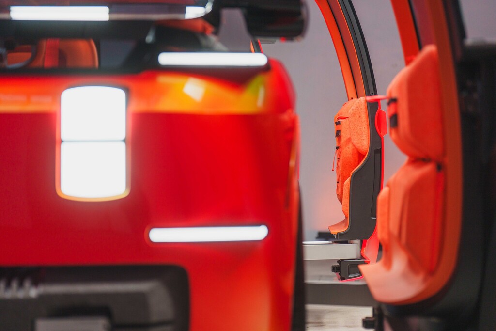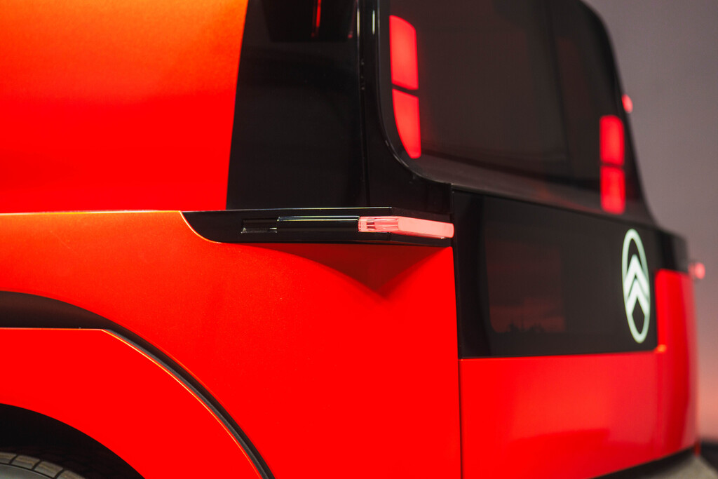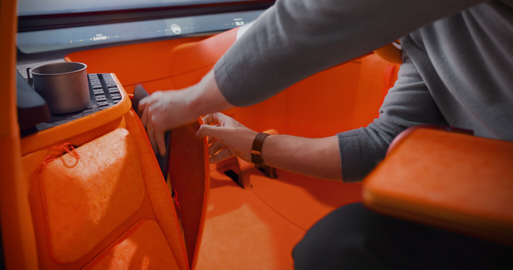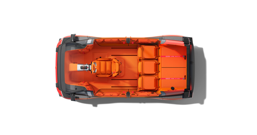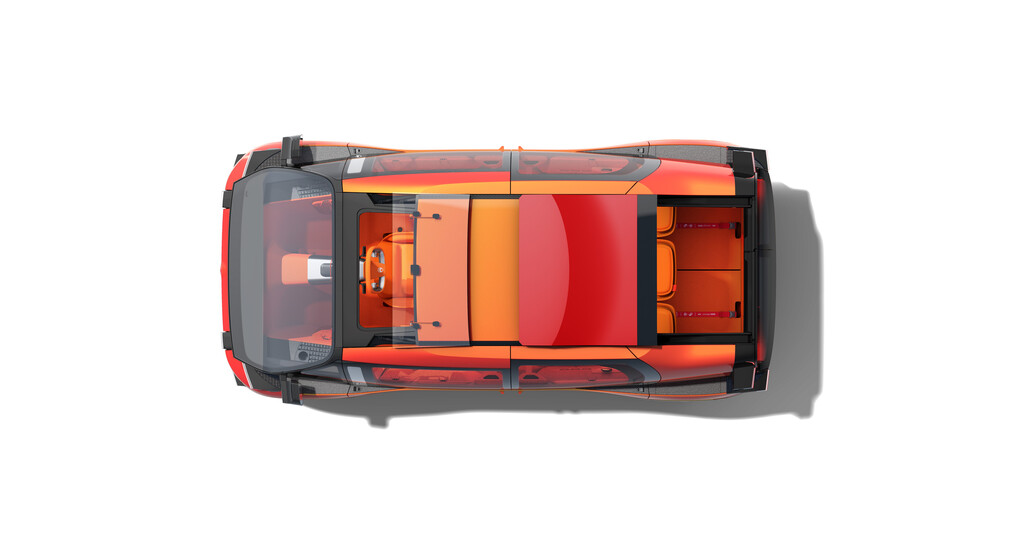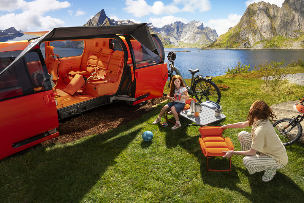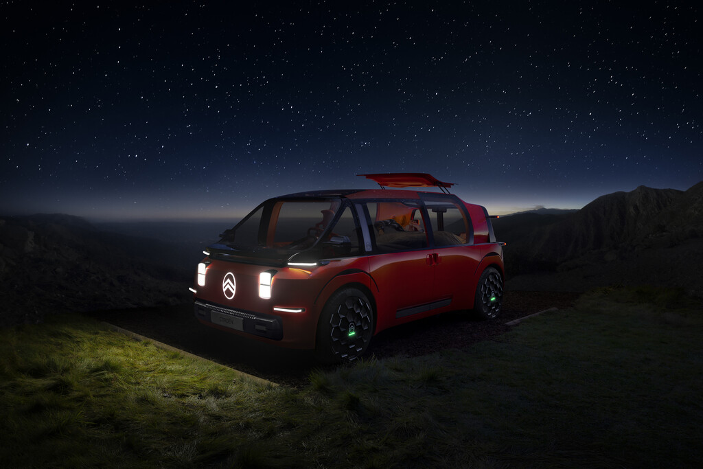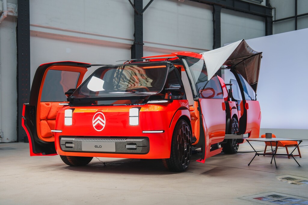 Der Elo entstand in Zusammenarbeit mit dem französischen Freizeit- und Sportspezialisten Decathlon und entsprechend deutlich ist das Element „Rest“ ausgefallen. Die Sitze im Fond lassen sich im Handumdrehen in eine Liegefläche für verwandeln, und eine Luftmatratze dient als Auflage für eine Nacht unter den Sternen, denn der Elo hat zwei Dachöffnungen, um Romantik in die gemeinsame Nacht zu bringen. Das erinnert an den 2CV, bei dem sich die Rückbank ebenfalls demontieren und gegen eine Schlafauflage austauschen ließ. Die beiden hinteren Lichtkapseln mutieren zu Nachttischlampen, und mittels von Decathlon entwickelten Halterungen lässt sich ein Overheadprojektor montieren, um auf einer ausfahrbaren Leinwand ein individuelles Unterhaltungsprogramm abzuspielen.