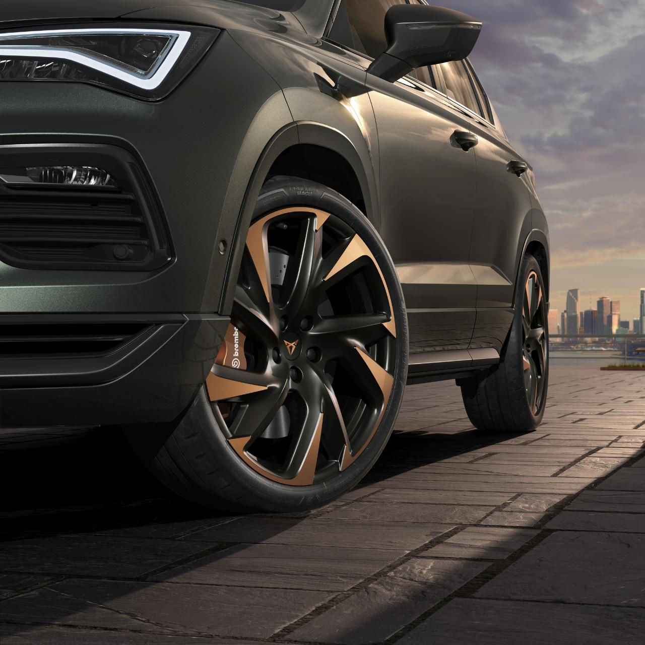 Den Ateca Tribe Edition kennzeichnen wahlweise die Außenfarbe Magic Black oder Dark Camouflage in Kombination mit neuen und exklusiven 20-Zoll-Leichtmetallfelgen in zweifarbigem Mattschwarz und Kupfer – einschließlich kupferfarbener Brembo-Bremssättel – sowie weiteren schwarzen Details. Fahrer und Beifahrer nehmen in zweifarbigen Schalensitzen in Dinamica-Schwarz und Shark Grey Platz.