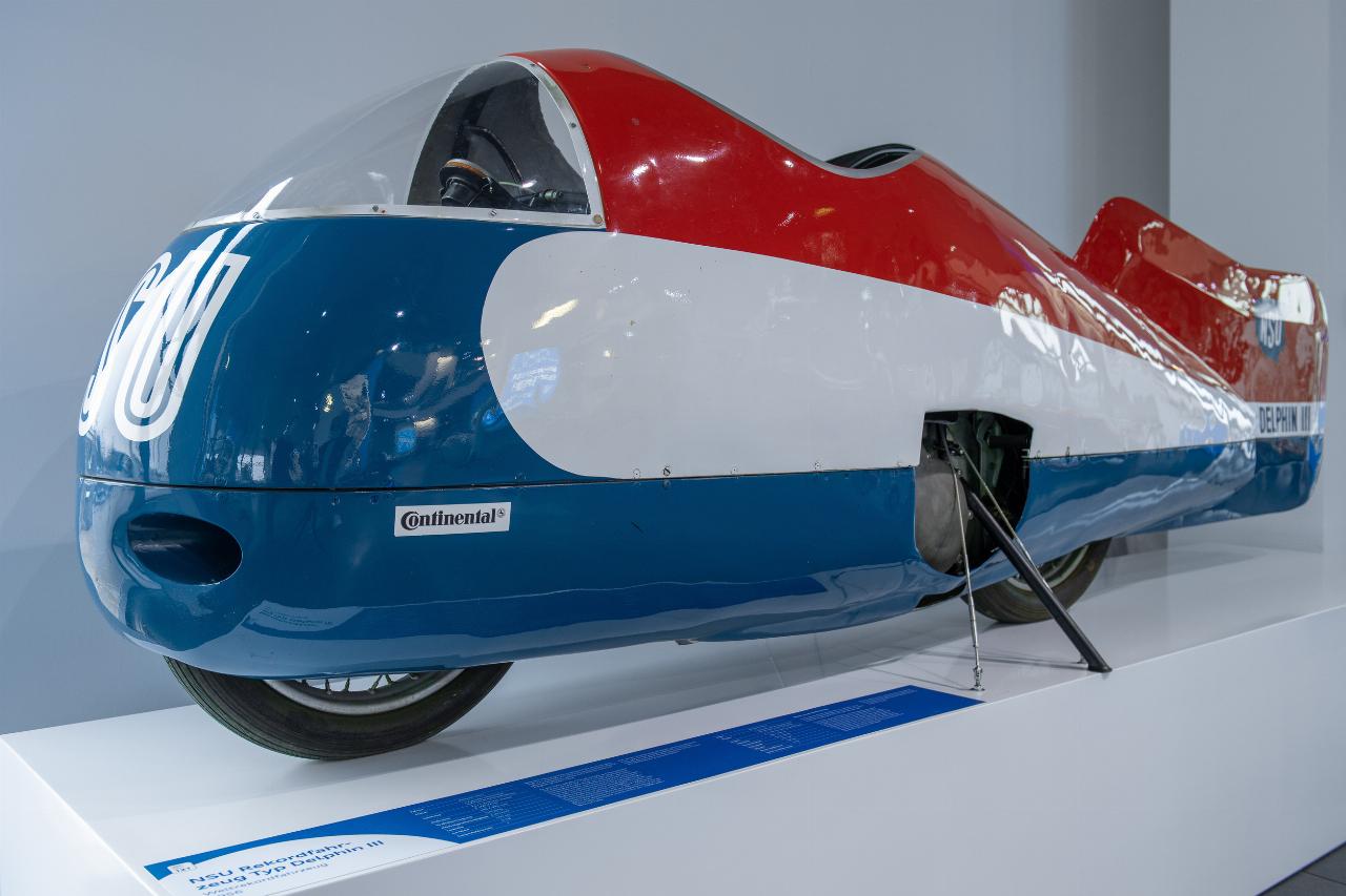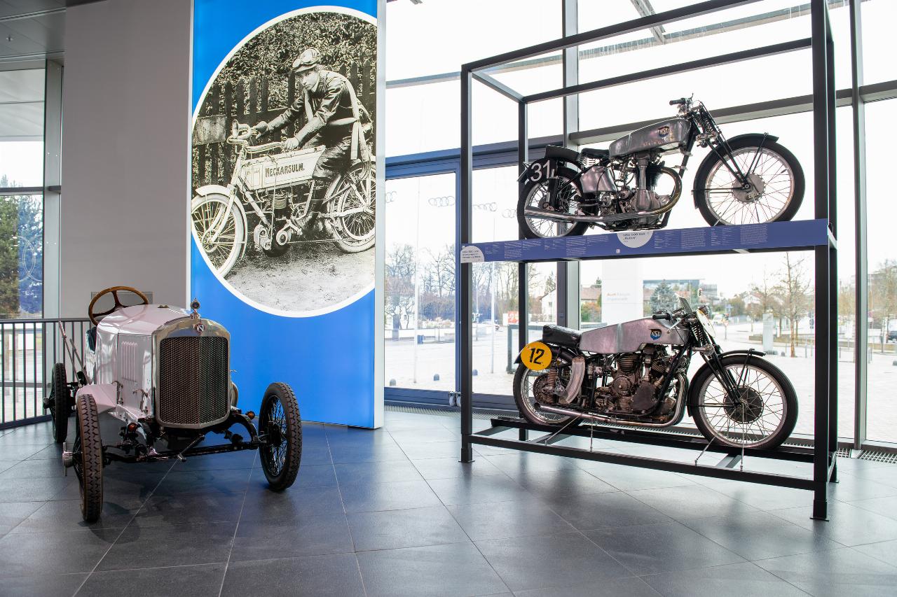 Unter den zahlreichen ausgestellten Motorrädern zeigt die Ausstellung das hubraumstärkste jemals bei NSU gebaute Motorrad: Die Zwei-Zylinder-Maschine von 1914 hat 8 PS und war das stärkste, schnellste und teuerste Serienmotorrad seiner Zeit. Für die 1575 Mark Anschaffungskosten musste ein Arbeiter damals im Schnitt fast zwei Jahre lang arbeiten. Auch das schnellste Motorrad der 1950er-Jahre ist Teil der Sonderschau: Die vollverkleidete NSU Delphin III erreichte 1956 eine Höchstgeschwindigkeit von 339 km/h. Neben den Exponaten liefern großformatige Schauwände und vier Multimediastationen weitere Informationen.
