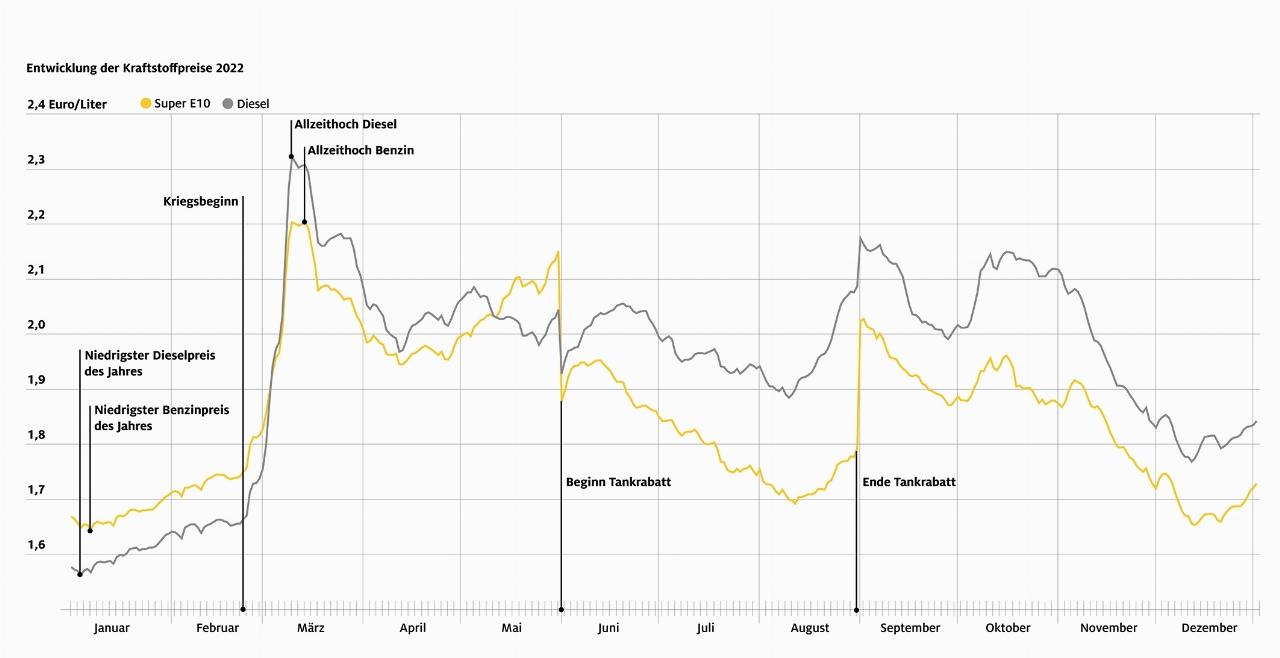 Nach Ansicht des ADAC lagen die Kraftstoffpreise 2022 insgesamt auf einem viel zu hohen Niveau. Das Potenzial für künftige Preisnachlässe sei gerade bei Dieselkraftstoff noch erheblich, denn für einen Liter Diesel fallen gut 20 Cent weniger Steuern an. Tatsächlich liegt der Dieselpreis im Jahresdurchschnitt aber um mehr als acht Cent über dem von Super E10. Die Differenz zwischen dem teuersten und preisgünstigsten Tag des abgelaufenen Jahres lag bei Super E10 bei 55,9 Cent je Liter (2,203 Euro am 14.3./1,644 Euro am 7.1.), bei Diesel sogar waren esi 75,9 Cent (2,321 Euro am 10.3., 1,562 Euro am 4.1.).